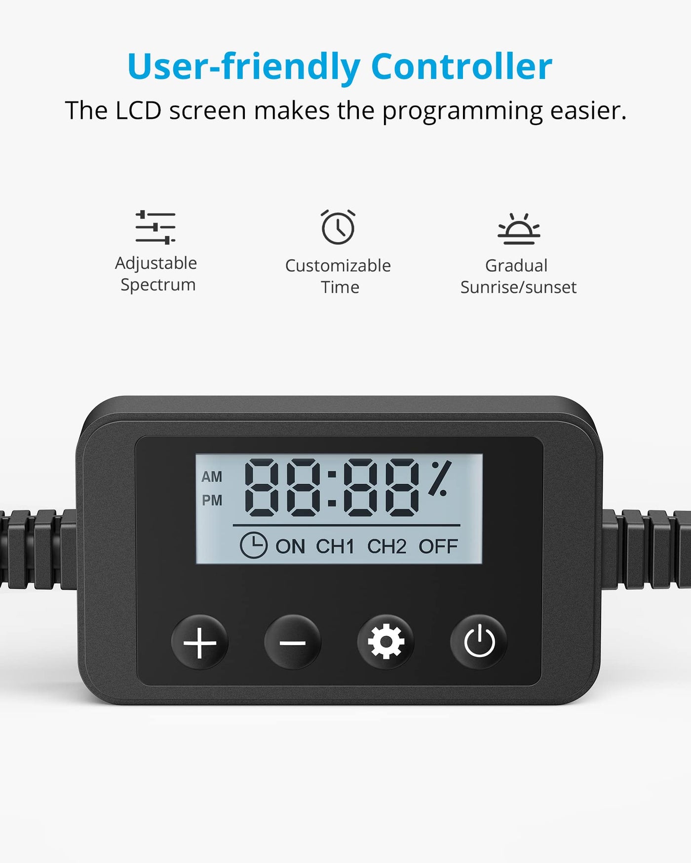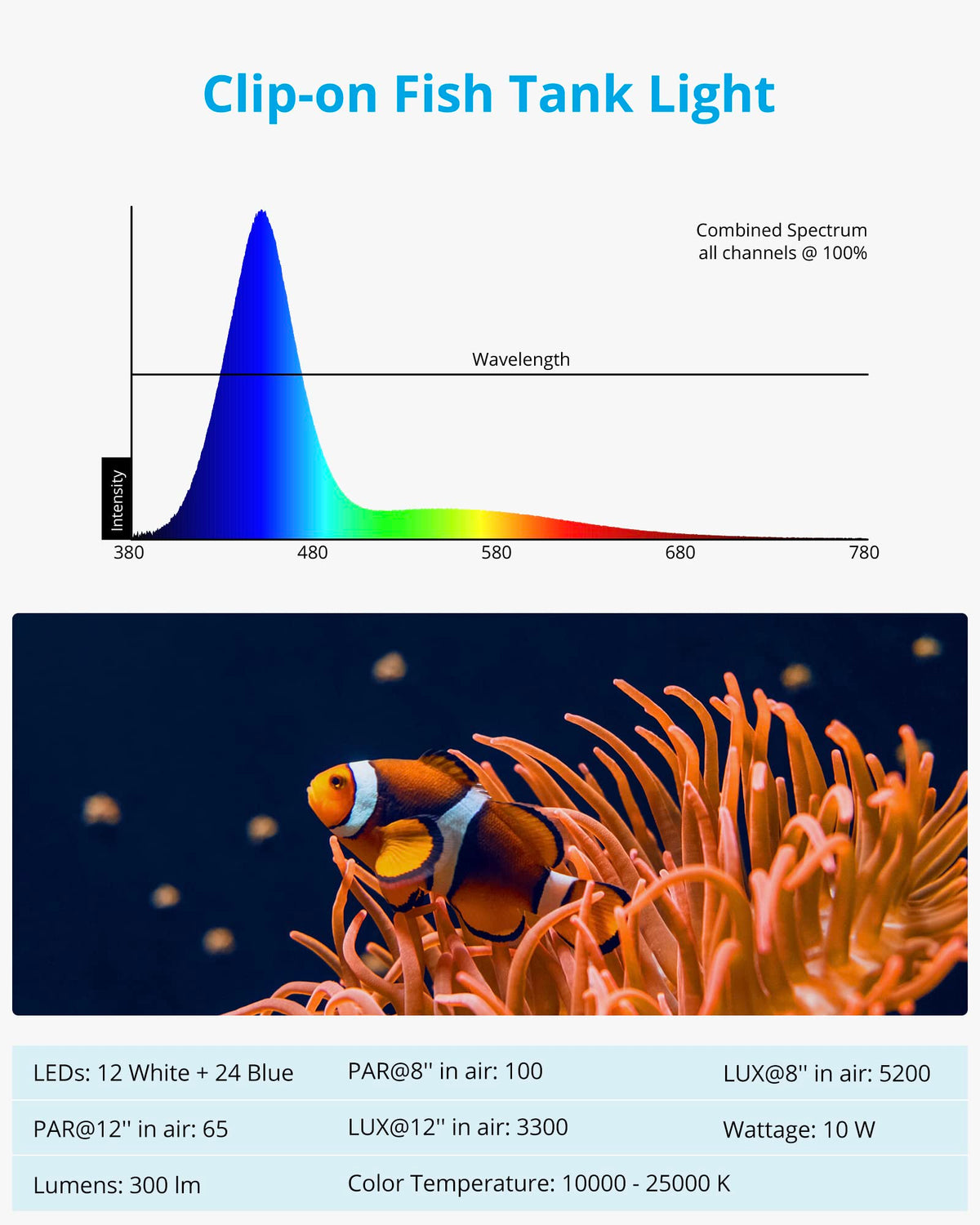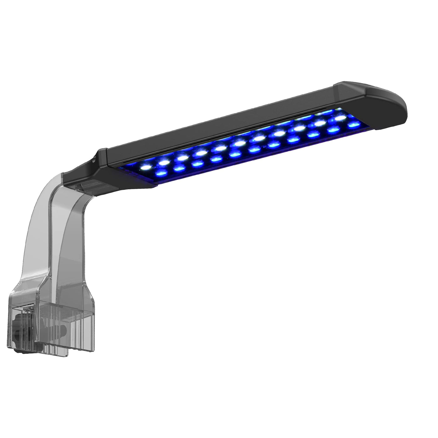 Ideal balance of blue and white LEDs brings out optimal colors for your fish and produces amazing shimmers for your aquarium Especially design for 25 - 5 gallon nano reef tanks It is suitable for saltwater fish live rocks and low-light soft corals For greater customization the brightness of the blue and white LEDs can be adjusted independently from 0% to 100% 30 minutes ramp-up and ramp-down to make creatures better adapt to changes in lighting effects Easily mounted on and secured to the glass of framed or frameless aquariums up to 58 with the clip-on bracket design