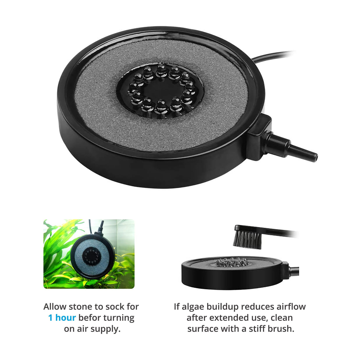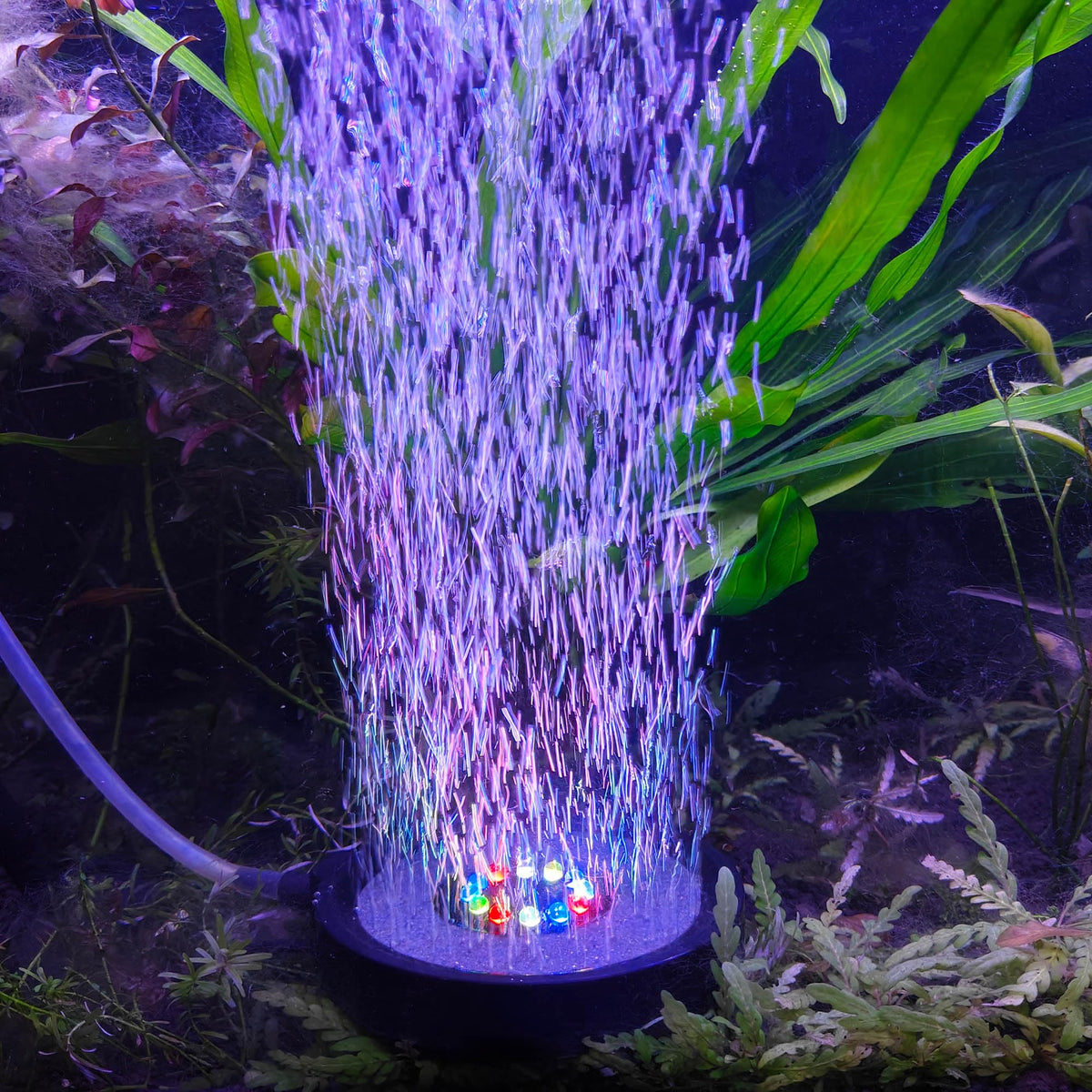 creates a healthy and decorative volcano of bubbles Submersible multi-colored LED lights add beauty to your aquarium Natural pores let bubble through into the water and keep your aquarium healthy Easy to install and makes for a soothing column of fizzy bubbles that looks great in any aquatic landscape Package : Bubbling Stone Disk with suction cup 316 in tube and power adapter Pump is not included