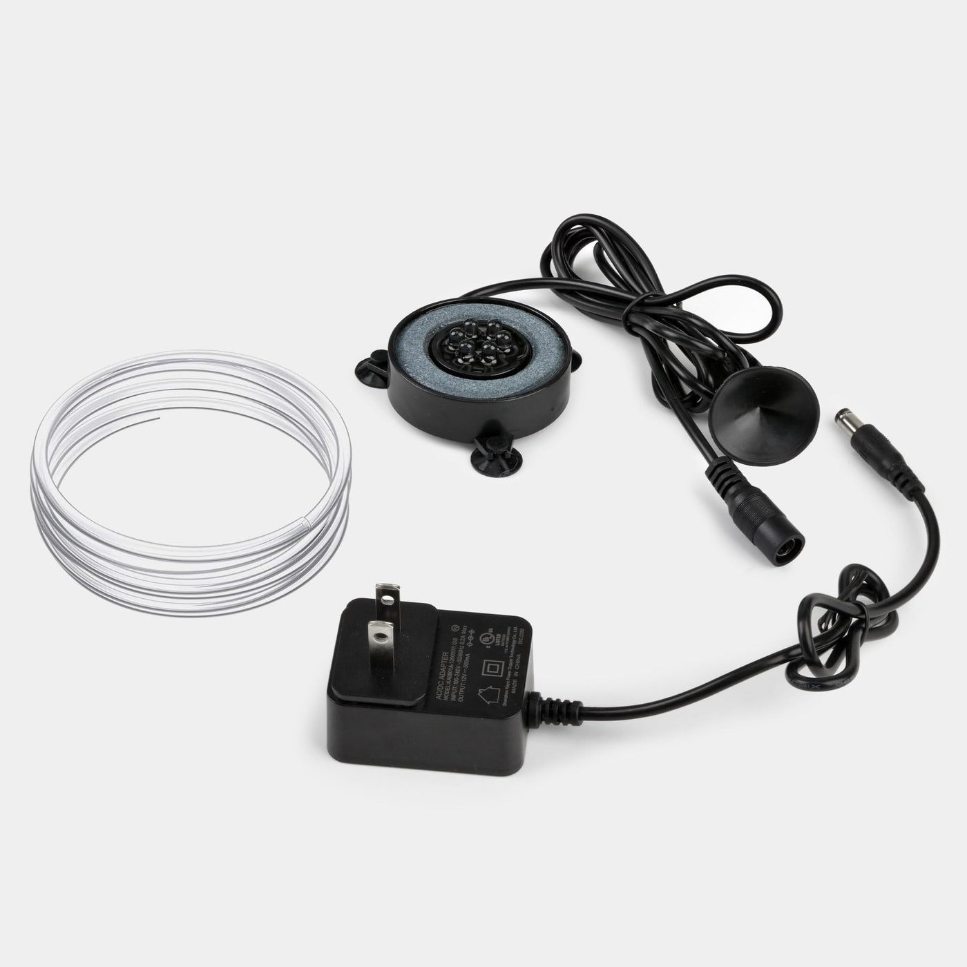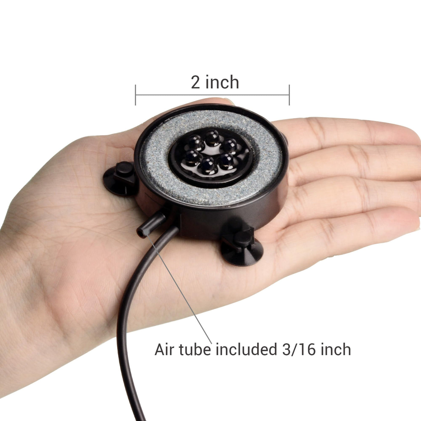 Package: Round stone disk with build-in multi-color LED lights 3/16 in a tube and power adapter. Pump is not included recommended to use with a 1.5W air pump and place the air pump higher than the water level of the fish tank