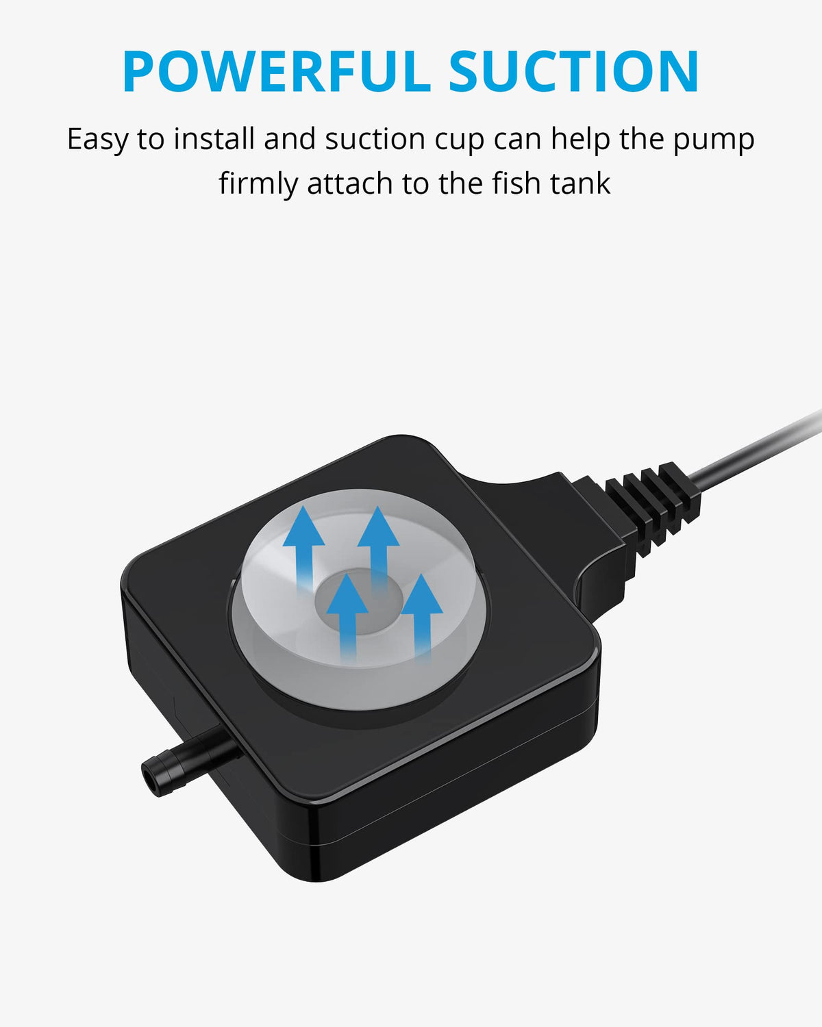 Performs reliable functionality keeps your aquariums oxygen levels high and provides water movement ensuring your fish stay healthy and happy Driven by a thin piezoelectric ceramic plate which makes it running virtually silent allowing you fully enjoy your aquarium without disruptive or annoying noises Efficient and easy-to-use this mini pump can handle the aeration needs of aquariums up to 10 gallon fish tank and safe for saltwater or freshwater systems No space taken up and easy to set up the nano pump can be attached on wall of fish tank with a suction cup comes with all you need Each kit contains air pump air tube check valve air stone and suction cup