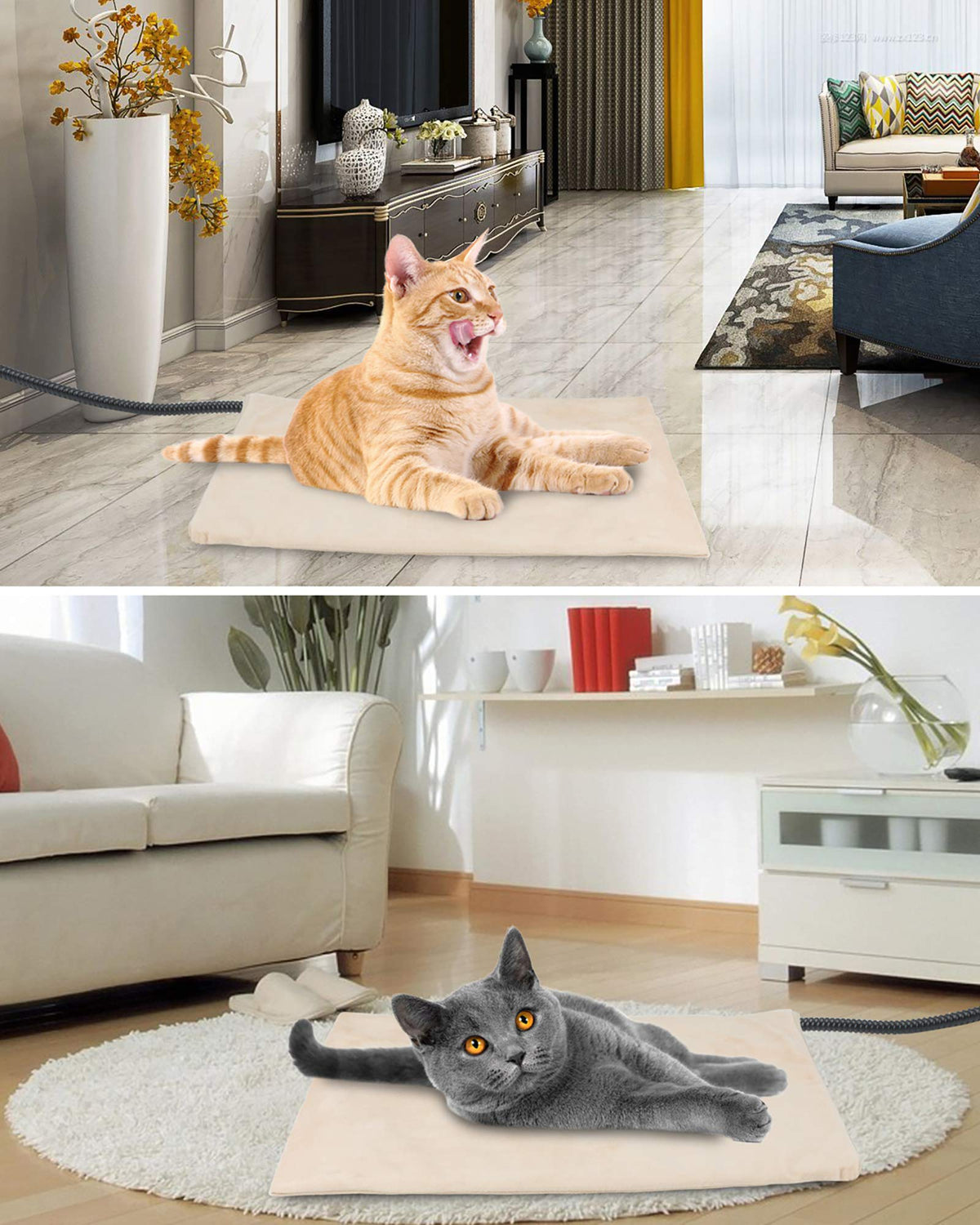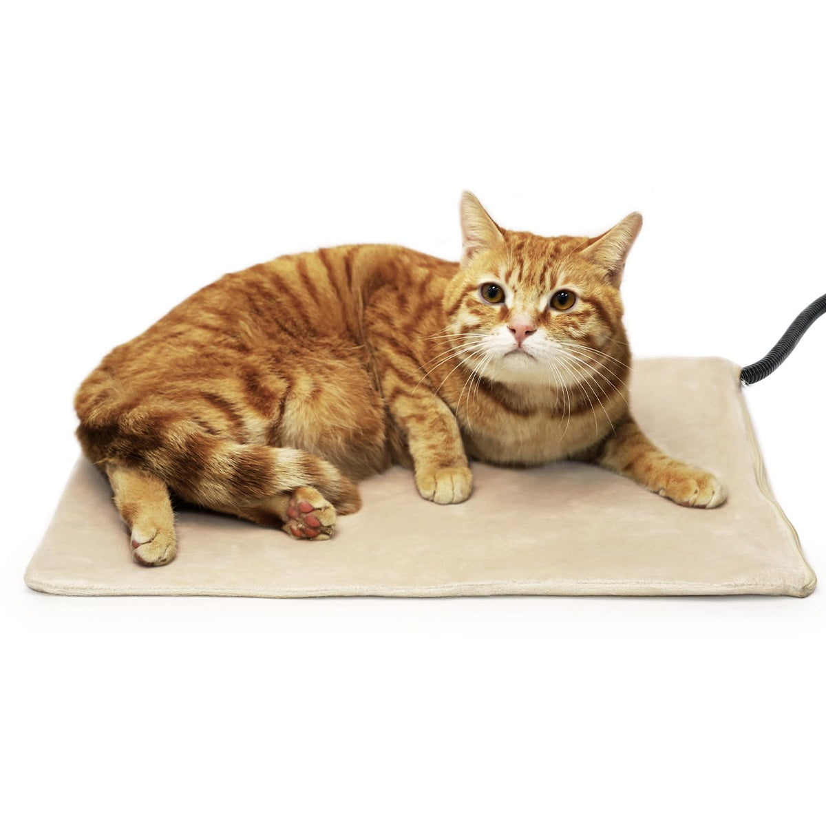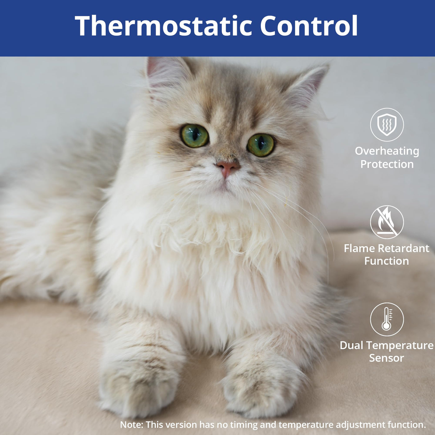 Built-in dual thermostat pet heating pad provides optimal comfort temperature for dogs & cats (96-108) This cat heating pad with washable and removable soft fleece cover provides a warm and cozy surface 5 foot steel-wrapped power cord to prevent cats or dogs from chewing wires durable and safe Measures 177 x 157 inches to provide a roomy lounging area suitable for cats small dogs and rabbits Recommended for indoor use to provide extra warmth for your pet anytime it is needed