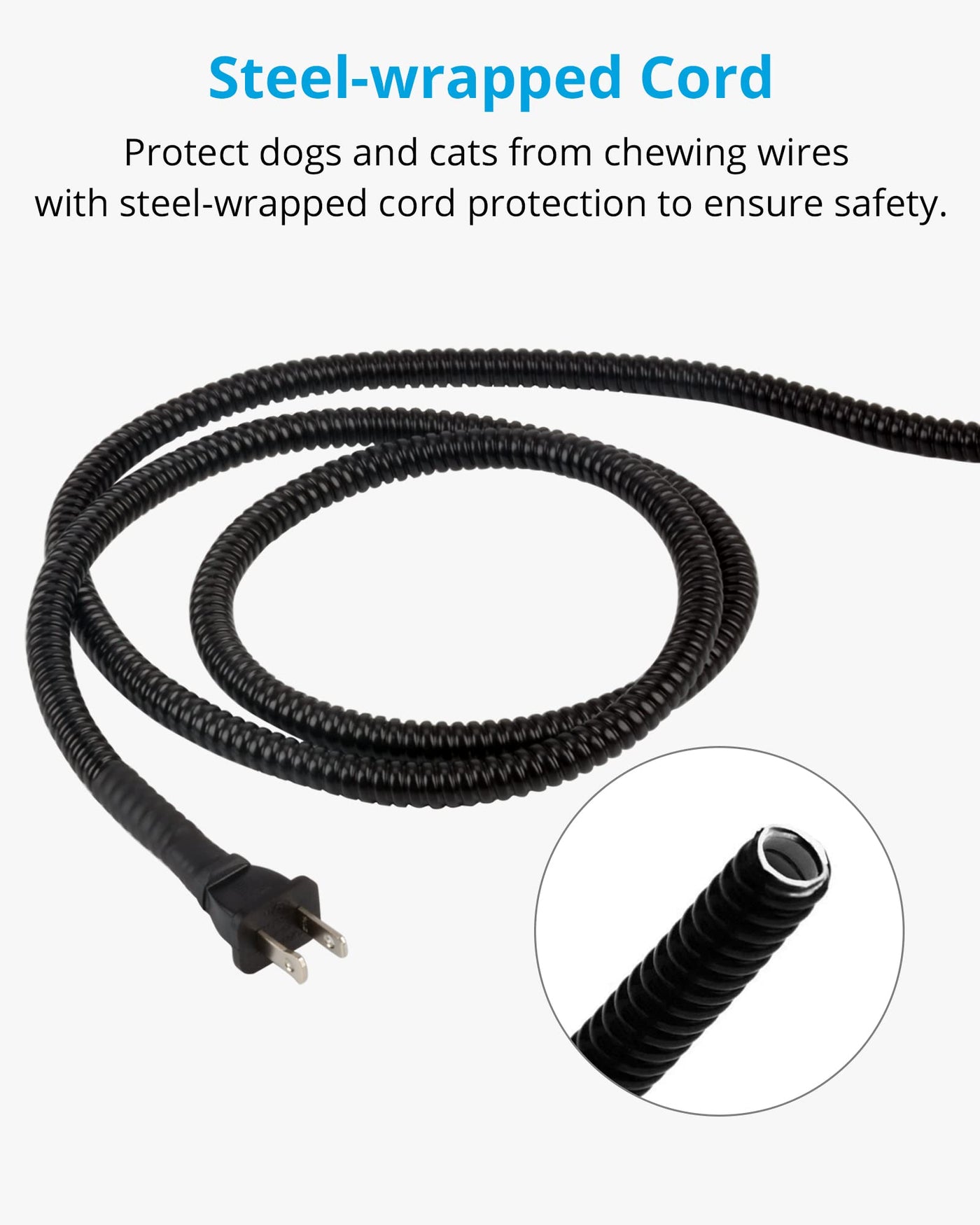 Q: How long is the power cord, and is it safe for pets?A: The NICREW Pet Heating Pad comes with a 5-foot steel-wrapped power cord designed to prevent pets from chewing on it, ensuring safety and durability.