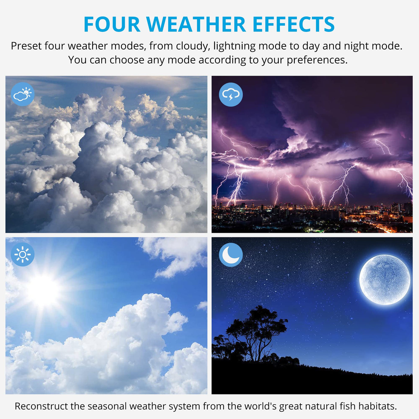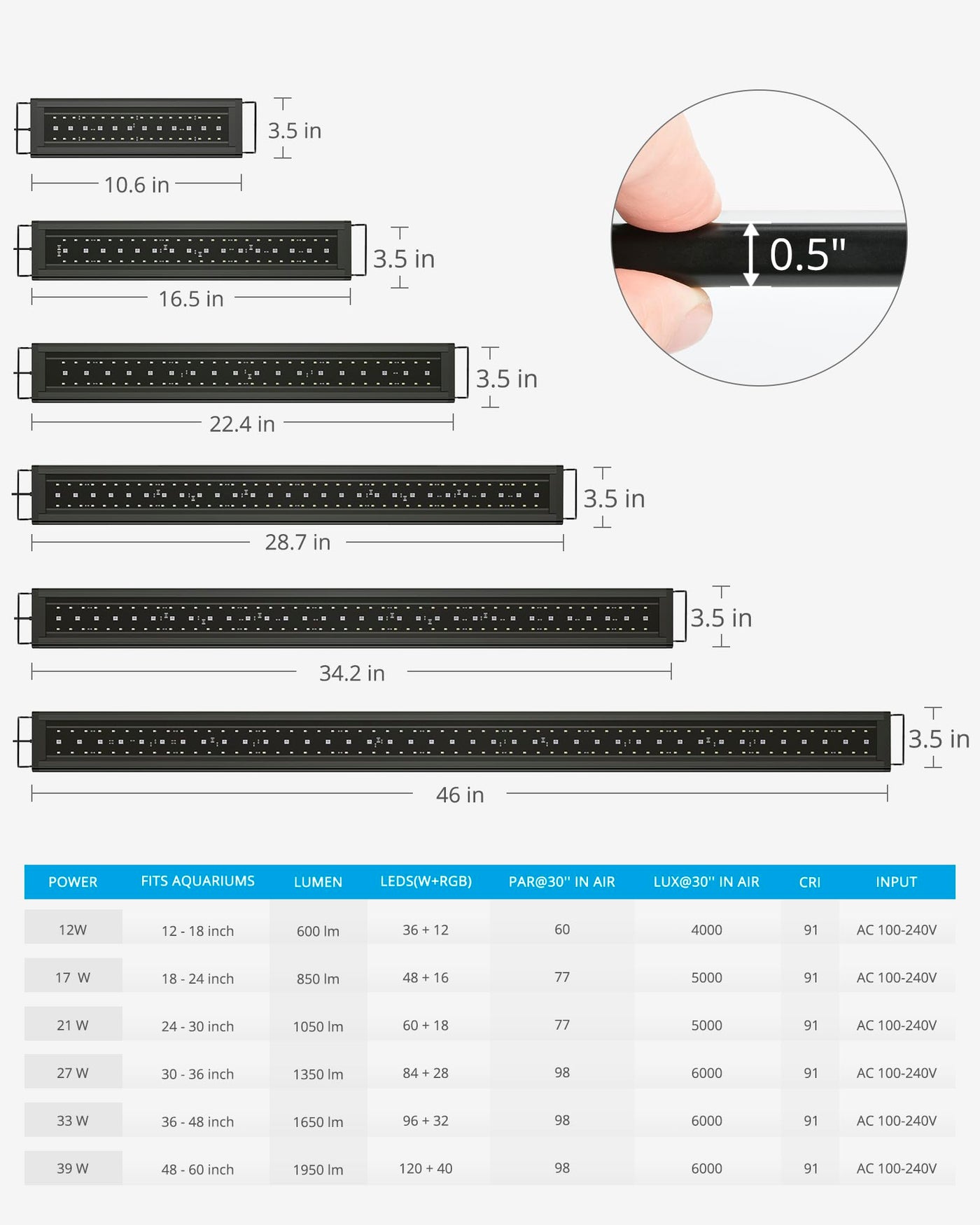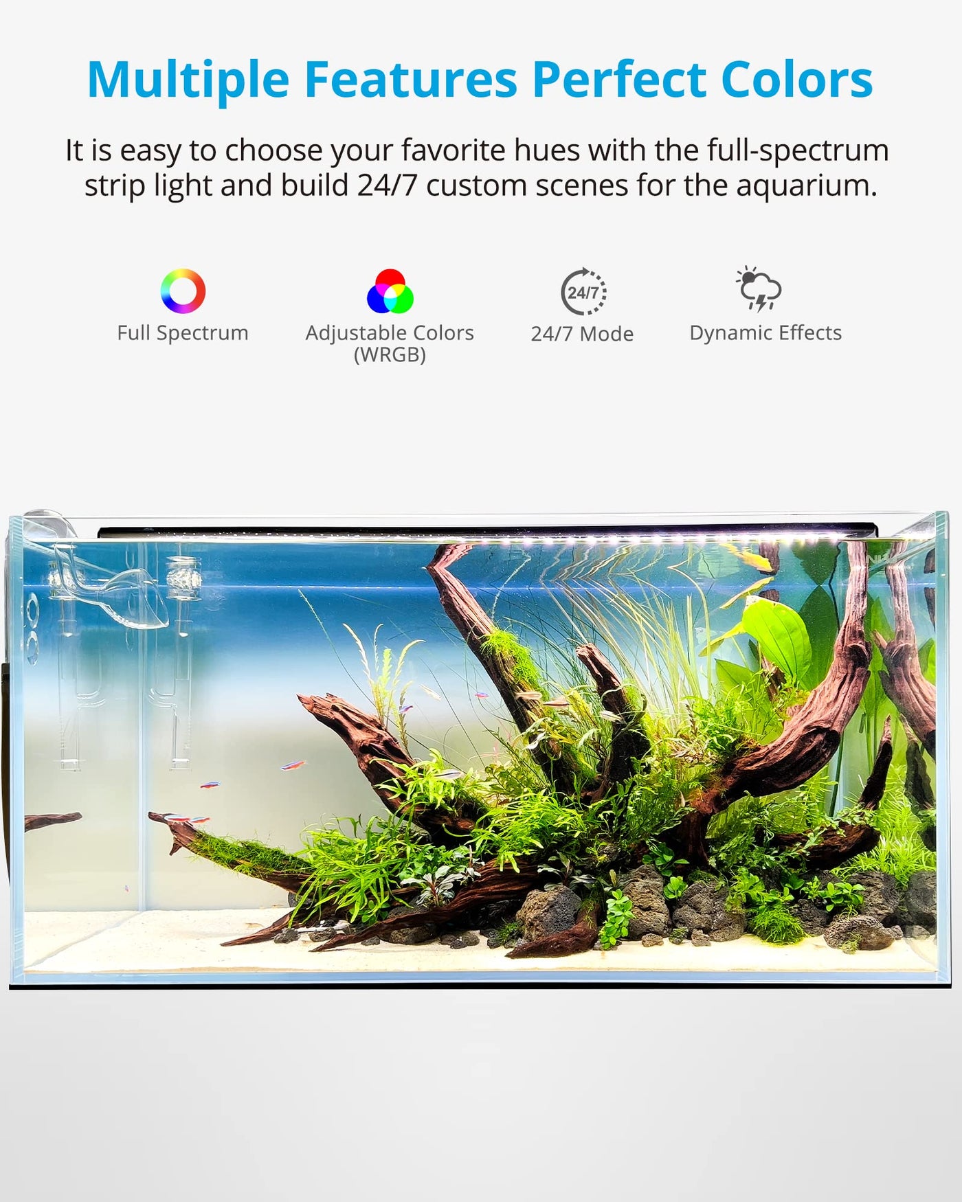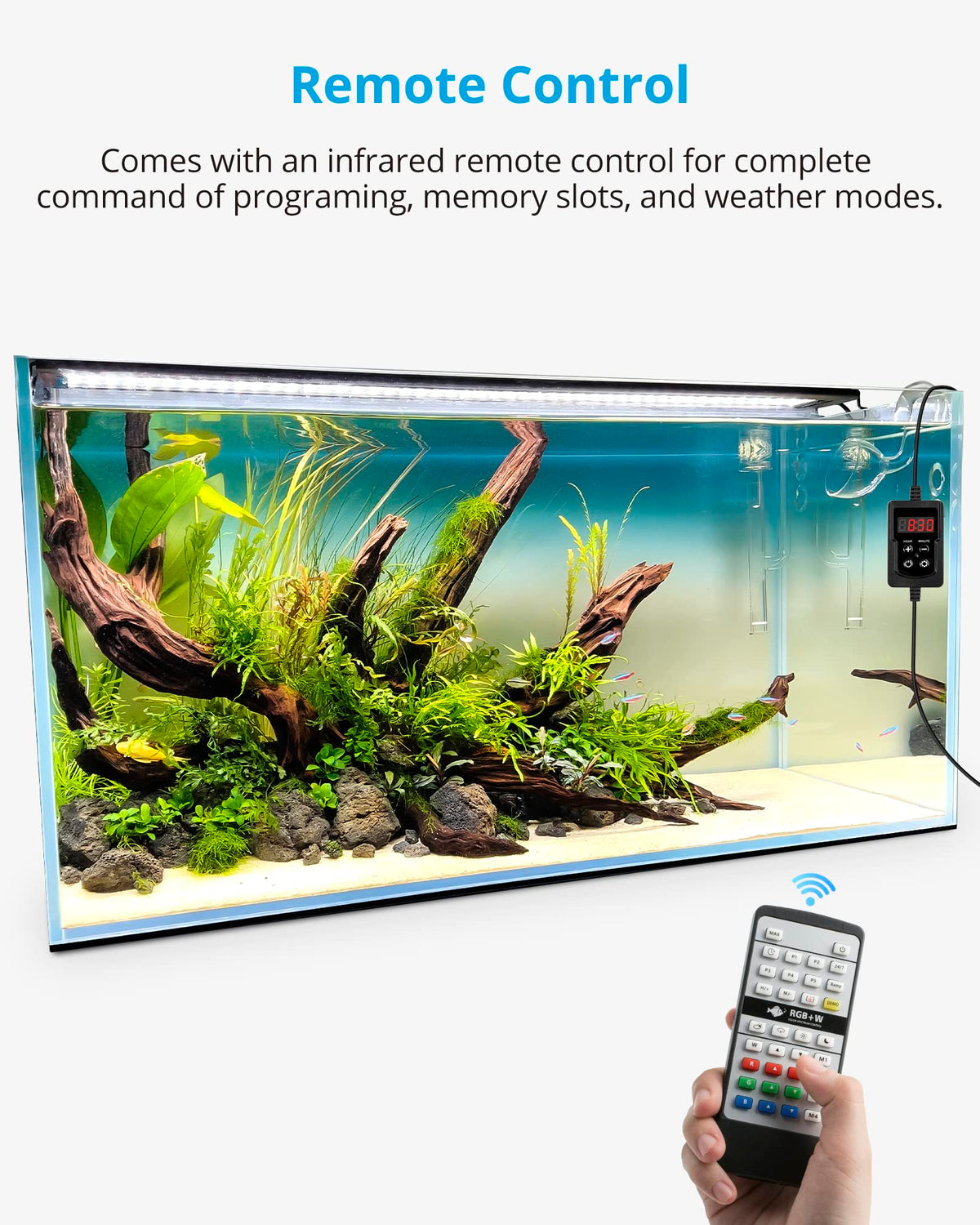 NIcREW RgB+W 247 plant aquarium lights highly customizable make your aquarium more vibrant Full spectrum for freshwater fish&plants and adjustable spectrum to provide better lighting environment for your aquatic plants Suitable for low to high light level plants Manual 247 setting: Built-in 5 time periods to set the lighting mode covering 24 hours Equipped with 3 sunrise and sunset modes (01530 mins) for higher customization Power-off memory function you only need to set the current time to return to the previous settings after the power is restored Multiple Functions: Built-in preset 247 mode to take care of your freshwater fish and plants just set the current time to enter the loop 5 built-in preset lighting modes create a dreamy aquarium environment comes with 4 weather modes to better simulate the natural ecosystem High Performance: Aquarium light is equipped with a remote control function for setting the exclusive mode LcD screen help you easily operate the entire fish tank lightThe cRI is up to 90 which can better show the true colors of plants and fish without distortion More Durable: IP67 Waterproof protect the light from water and humidity intrusion even if it is accidentally immersed in water High-quality LEDs at least 35 000 hours service time The aluminum shell with high heat dissipation capacity is adopted to improve the durability of the fish tank light