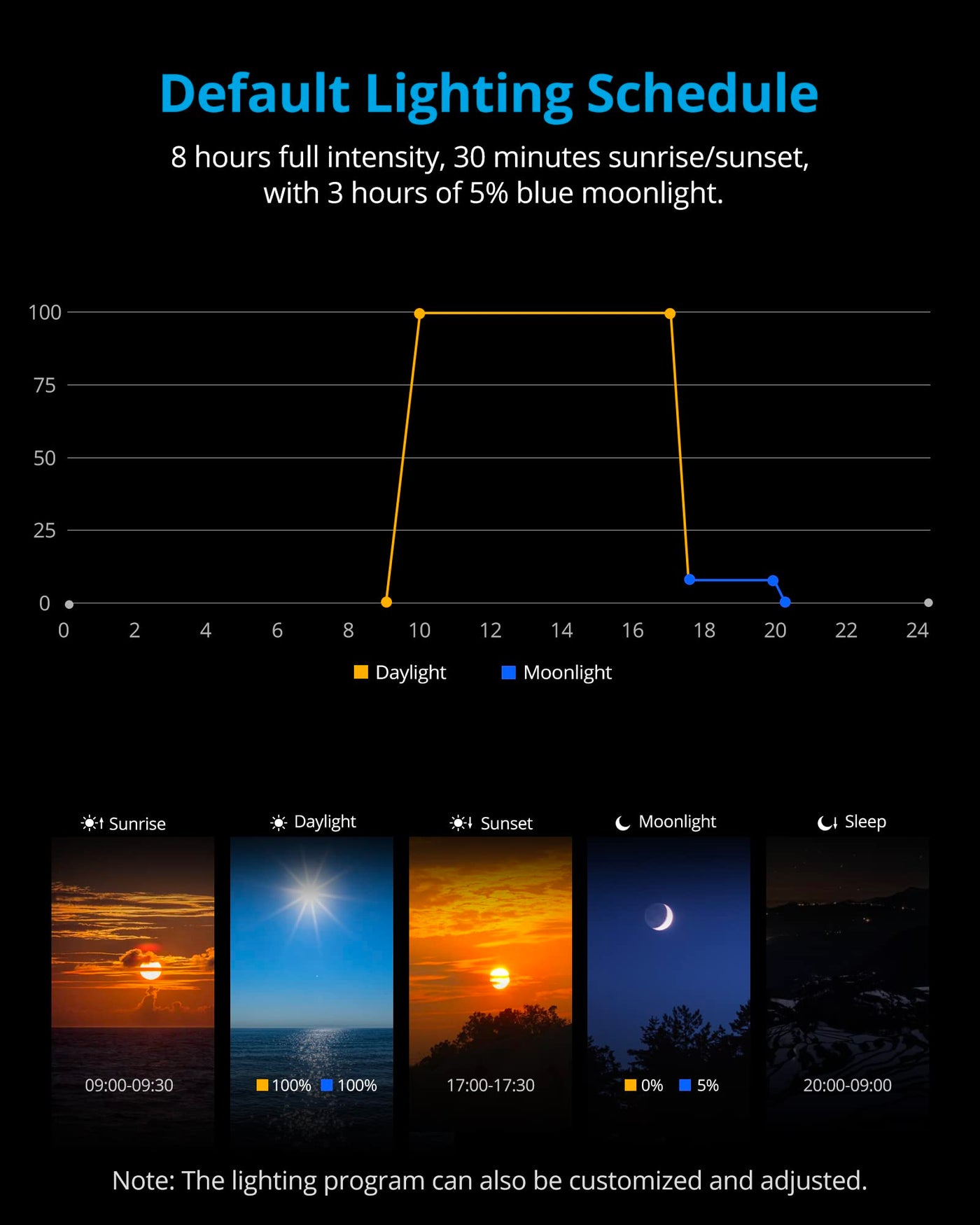 Super bright 6500K white LEDs combine with 450nm blue and 660nm red LEDs creating the full spectrum lighting effect Adjustable day and moonlight color spectrum and intensity with the wired switch on the power cord day and night lighting channels can be operated together or independently Adjustable docking legs allow quick and easy adjustments for a wide variety of installations equipped with the brackets to extend to 36 - 48 inches LED light designed to brighten up your aquatic environment ideal for freshwater and medium-high light level plants help support and grow plant A glass or acrylic canopy is highly recommended to extend the life of the unit by preventing moisture from affecting it