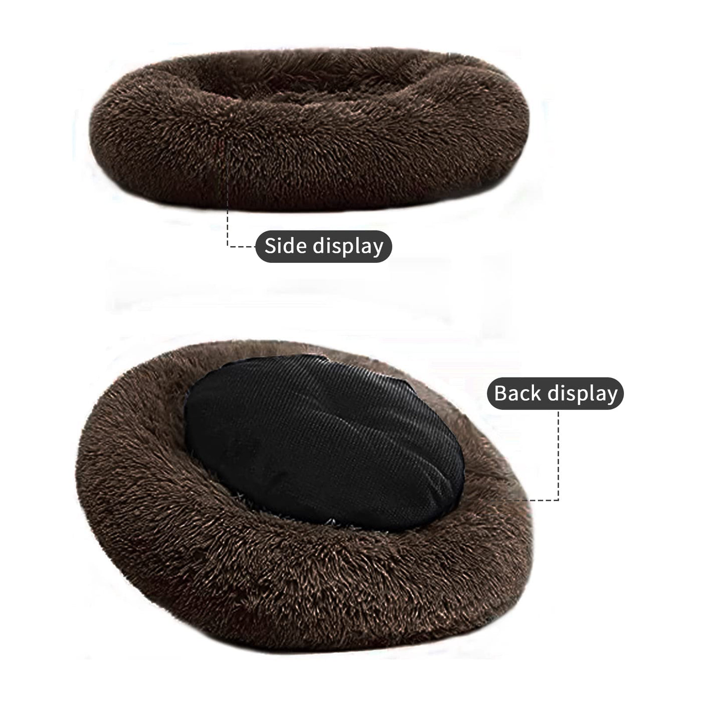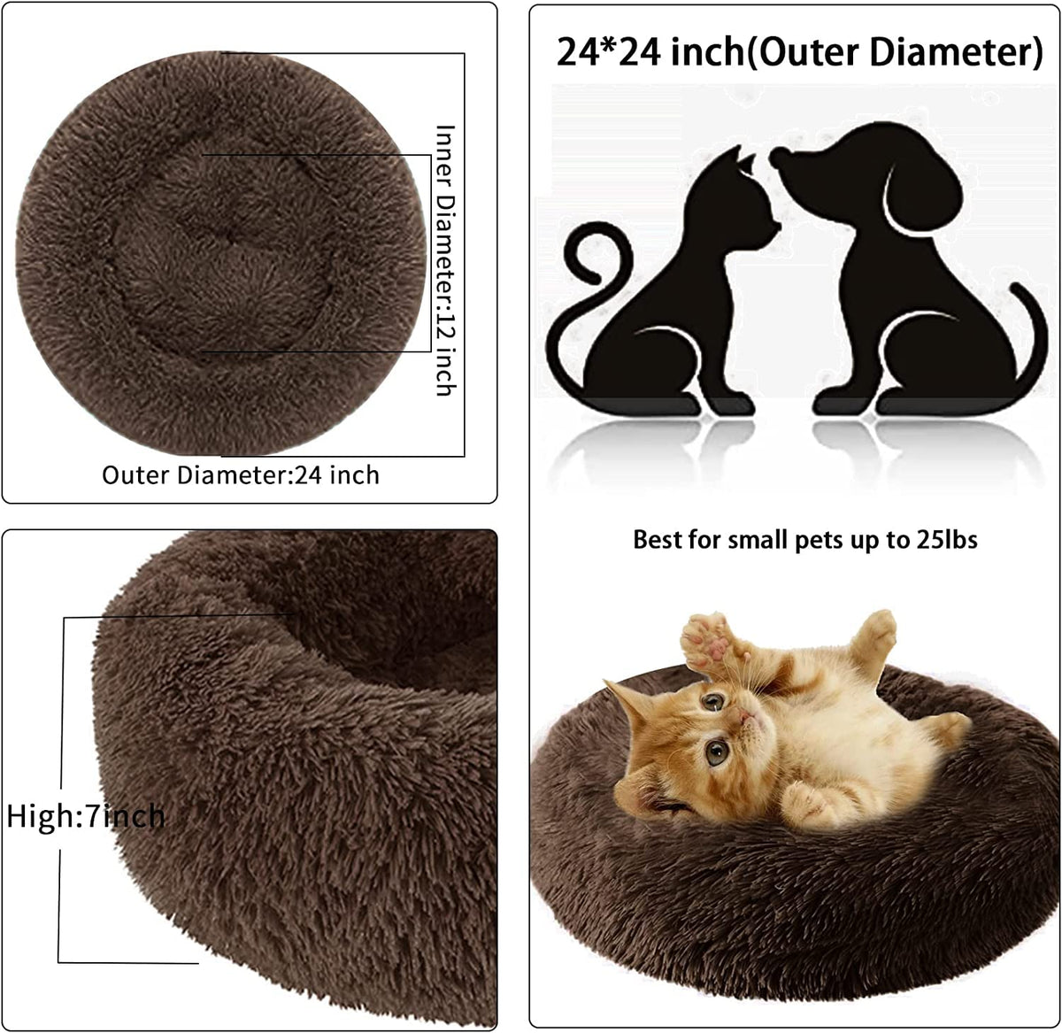 esign for cozy Sleep: cat beds or dog beds are the circular donut design The raised edges create a comfortable sense of security while providing head and neck support to help your dogs or cats calm down faster get a more comfortable and stable sleep Super Soft Feeling: The pet calming dog bed are made of soft plush fabrics Paired with premium pp cotton filling it increases the overall comfort of the dog bed Very suitable for small or melium dogs in cold winter ensuring your furry pets surrounded by comfort and warmth providing soft support for the pet such as kitten or puppy which relieves the pet muscle and joint pain Easy to clean and care: We usually recommend hand washing to easy care for the pet beds If you choose machine wash just toss whole anti-anxiety dog bed into the washing machine with gentle cycle And dry the donut dog bed in the dryer on low heat after washing Recommend leave it for a while after receiving the calming dog bed it will return to shape after shaking ive sizes are available for your choice We recommend 20x20 inch dog bed for small dogs (up to 15 pounds) 24x24 inch dog round bed (up to 25 pounds) and 27x27 inch dog calming bed (up to 35 pounds) 30x30 inch dog donut bed (up to 42pounds) 36x36 inch (up to 100 pounds) it is recommended that you measure the size of your pet before buying Wide Range of Use: The round cat beds and dog beds feature an anti slip bottom which can prevent moving and shifting to ensure the safety of petsOur pet bed works great not only on your home floor but also on the seat of your car It can be conveniently placed on the trunk or back seat as a travel bed for pets to rest and relax