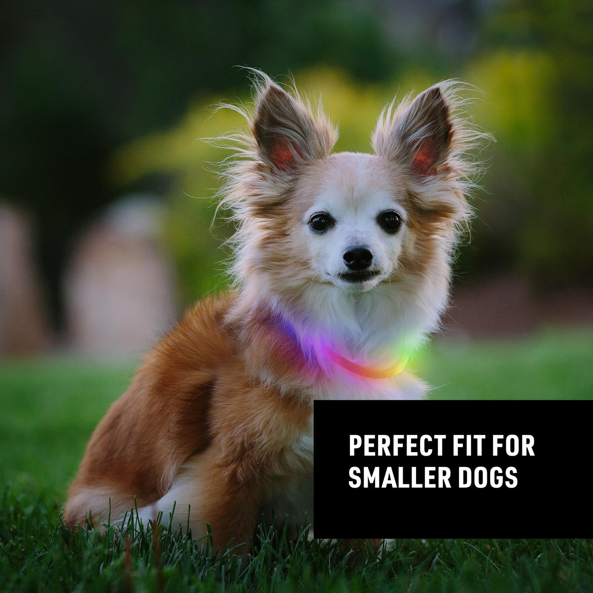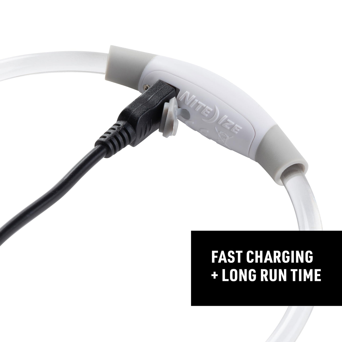 Rechargeable & Adjustable Dog Accessories: This light-up necklace can be cut to fit dog's necks from 9.5' to 14.8'; use the micro USB cable to recharge after 4 hours of play time | Dog Necessities for Safety: This bright LED dog necklace illuminates a full 360 Degree around your dog's neck, so your pet will be visible during night activities | Weather-Resistant LED Necklace: This weather-resistant, light-up dog safety necklace can be used over and over again; keep your dog safe when walking in the rain | High Visibility for Dog Walking: Use the push button to turn on and off; use the glow and flash modes and colors to keep your dog safe when walking or running at night | About Nite Ize: Our inventor-driven products organize your life, protect your gear, light your way, and creatively solve everyday problems; every product is backed by our Worry Free Guarantee