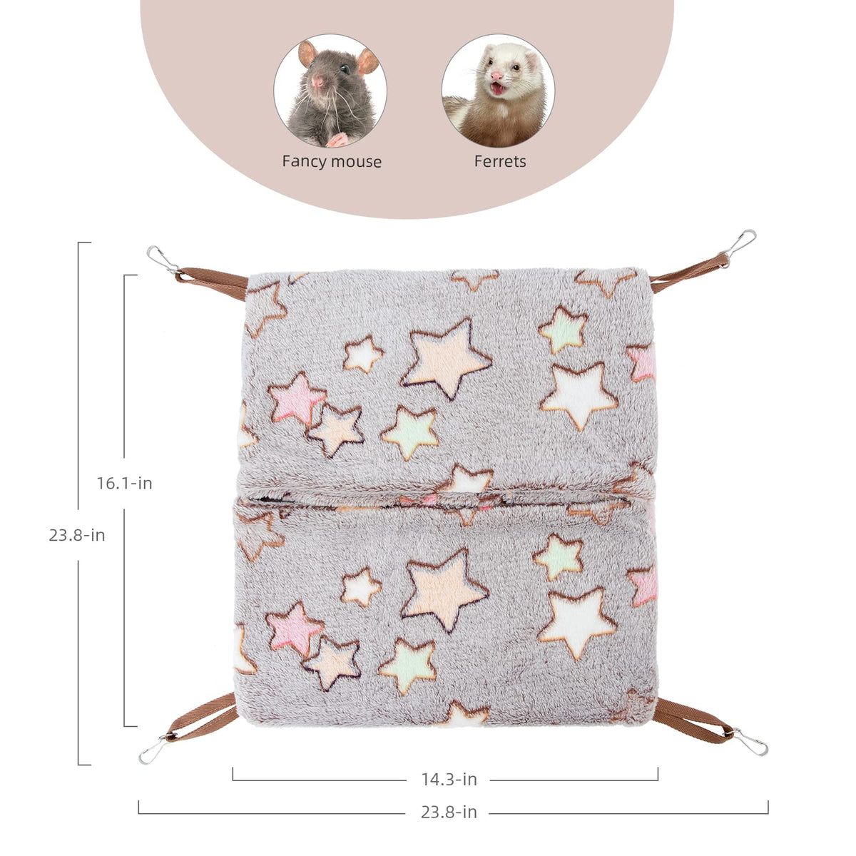 Give your ferret a cozy place to rest with the Niteangel Hanging Nap Sack Ferret Hammock. Ferrets are very sensitive to heat and hammocks provide a comfy place to snooze. The Niteangel Hanging Nap Sack Ferret Hammock measures 15.8'' x 15.8'' inches and hangs easily inside or outside the cage. It is made of a soft, fleece-like fabric that is easy to clean and big enough for two ferrets. Ideal for Ferrets, Rats, Mouses, Suger Glider and other small animalsPrecautions HAZARDS TO ANIMALS: As with any ferret toy, bedding, accessory, or containment product, periodically inspect your Nap Sack for damage and/or excessive wear. Immediately remove any objects that are damaged or excessively worn, as they could cause serious injury and/or loss of a pet. Instructions Washing Instructions: Machine wash on gentle cycle with like colors. Wash in cold water and use regular strength detergent. Tumble dry low heat. Hanging Instructions: Fasten each of the four metal swivel clips to the bars of your ferret's cage. Hang in a location that is easily accessible to your pet, but that still won't inadvertently swing against any objects or cage sides and cause injury. Ferrets that are good at, and relish, climbing might prefer the Nap Sack be hung away from other objects to offer maximum safety. Non-climbers would benefit from the hammock being hung close to a cage shelf or tunnel opening for easy access.