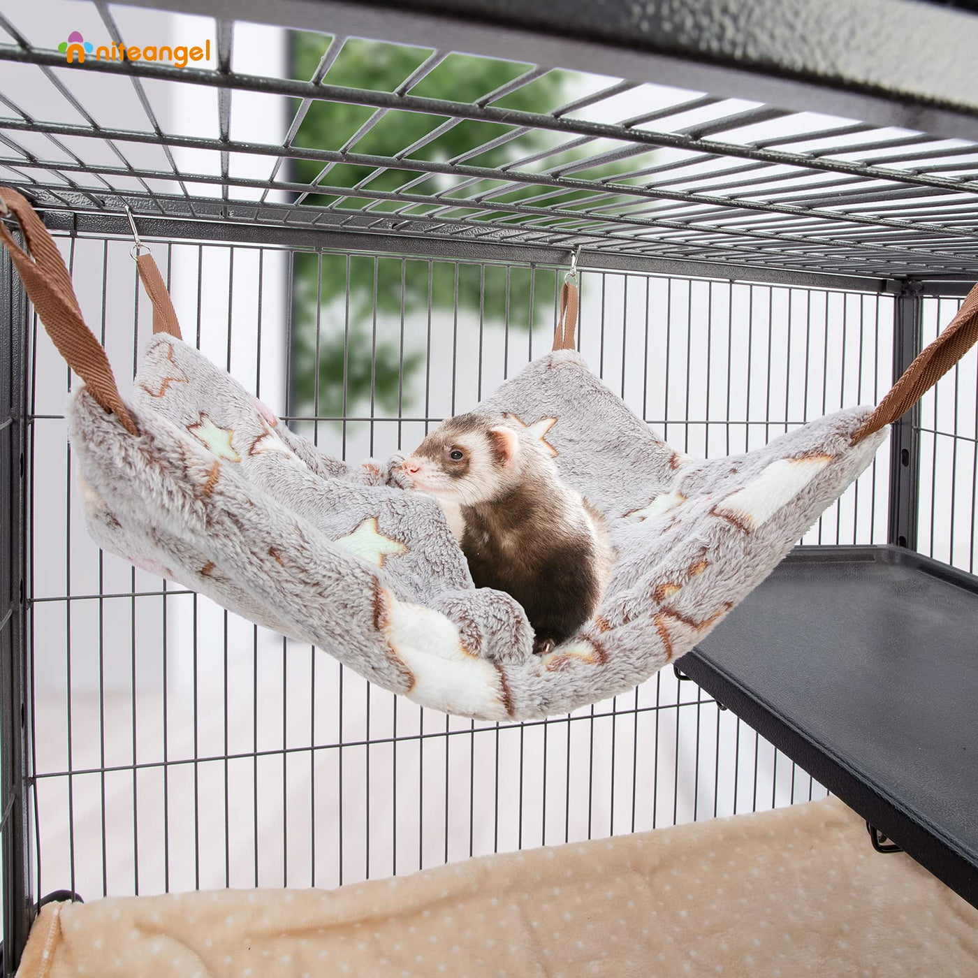 Q: Is the material of the Niteangel Hammock safe for pets?A: Yes, the Niteangel Hammock is made of a soft fleece-like fabric that is safe and comfortable for small animals. It is important to regularly inspect it for any damage or excessive wear to ensure your pet's safety.