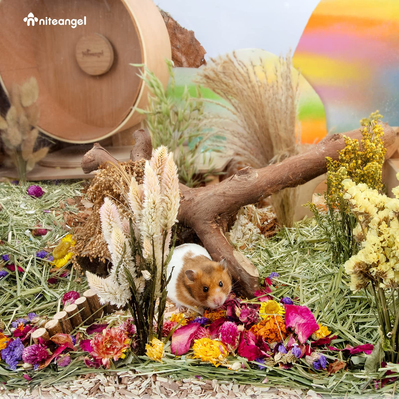 Natural and Unique Hamster Flower Bedding: Are you still looking for the perfect companion for your boring hamster bedding The Niteangel natural flowers can be maxed with all other bedding such as aspen bedding or paper bedding to add more color and interest to hamster cage or habitat Its highly recommended for dwarf hamsters Syrian hamsters gerbils mice degus guinea pigs or other small pets Artistic Style & Natural Smell: Each petal is a gift from nature hand-picked and carefully selected the best petals naturally air-dried without any add Flower hamster bedding in a variety of colors is not only pretty and pet friendly but also provides great odor control for the hideout whether its decorating a hamster passage or taking to a hamster hideout for storage or eating it can give your hamster a whole new experience Safe Materials & More Experience: capacity: 35 OZ(ca 100g) We are always want to find safe and happy stuff for our pets these dry varieties have been repeatedly researched by pet experts to pick out the safe flowers that children love such as purple Myosotis Reed Sunflower wild Oat and etc Not only can decorate your hamsters home but also provide more different textures to enrich their chewing experience and be a new hamster toy Break boredom and themed buildings: When you build a nature-themed cage with an ordinary paper bedding or aspen bedding lets add some special niteangel flower elements to build an artistic hideout for your little pet How to build a unique small pet habitat There is nothing better than a gift of dried natural flower bedding just a few petals to let your little pet explore as if it were in flowers The bag is resealable please make sure to reseal and keep out of direct sunlight And for the well-being of small pets please always pick out the mess petals from your pets habitat that may be wet or have small due to pet waste Believe it or not no any small pet can deny the perfect safe flower bedding