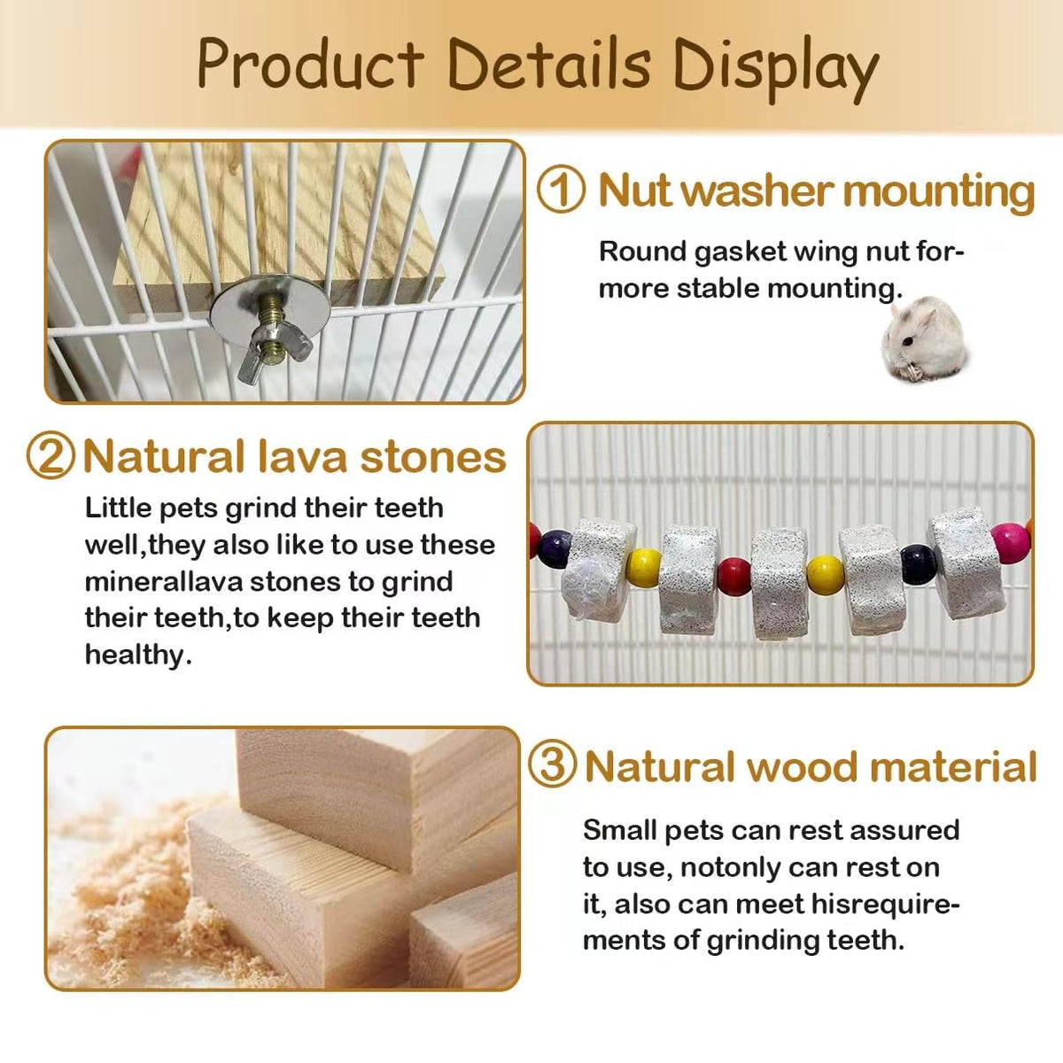 The Platform And Lava Gringing Blocks Are Made Of Natural Materials Suitable For The Variety Of Hamster, Mouse, Chinchilla Chipmunk, Rat, Mice, Gerbil, Dwarf. This Stone String Is Ideal For Gnawing Pets To Keep Their Teeth Clean, Healthy And Trim. It Can Be Placed Anywhere Inside Chinchilla'S Cage. Provide More Rectangular And Round Platforms Satisfy Small Animals Natural Instincts To Be Above Ground Level For Climbing, Playing And Sleeping. They Can Keep His Teeth Super Shaped By Nibbling On These Square Natural Minerals. The Teeth Of Small Rodents Grow Continuously, Owners Need To Prepare Grinding Tools For Them, Or Else They Will Be Uncomfortable If Their Teeth Are Too Long. Specifications: Material: Natural Wood + Lava Stone Type : Pet Wood Platform With Chewing Toys Package Include:&Nbsp; 1 X Hamster Wooden Platform 3 X Rectangular Climbing Board 3 X Round Platform Size: Chinchilla Platform: 12L X 5.9W X 5.9H / 30 X 15 X 15 Cm Rectangular Wooden Platforms: 5.9 X 3.1 Inches / 15 X 8 Cm Round Hamster Platform: 4.7 Inches / 12 Cm (In Diameter)