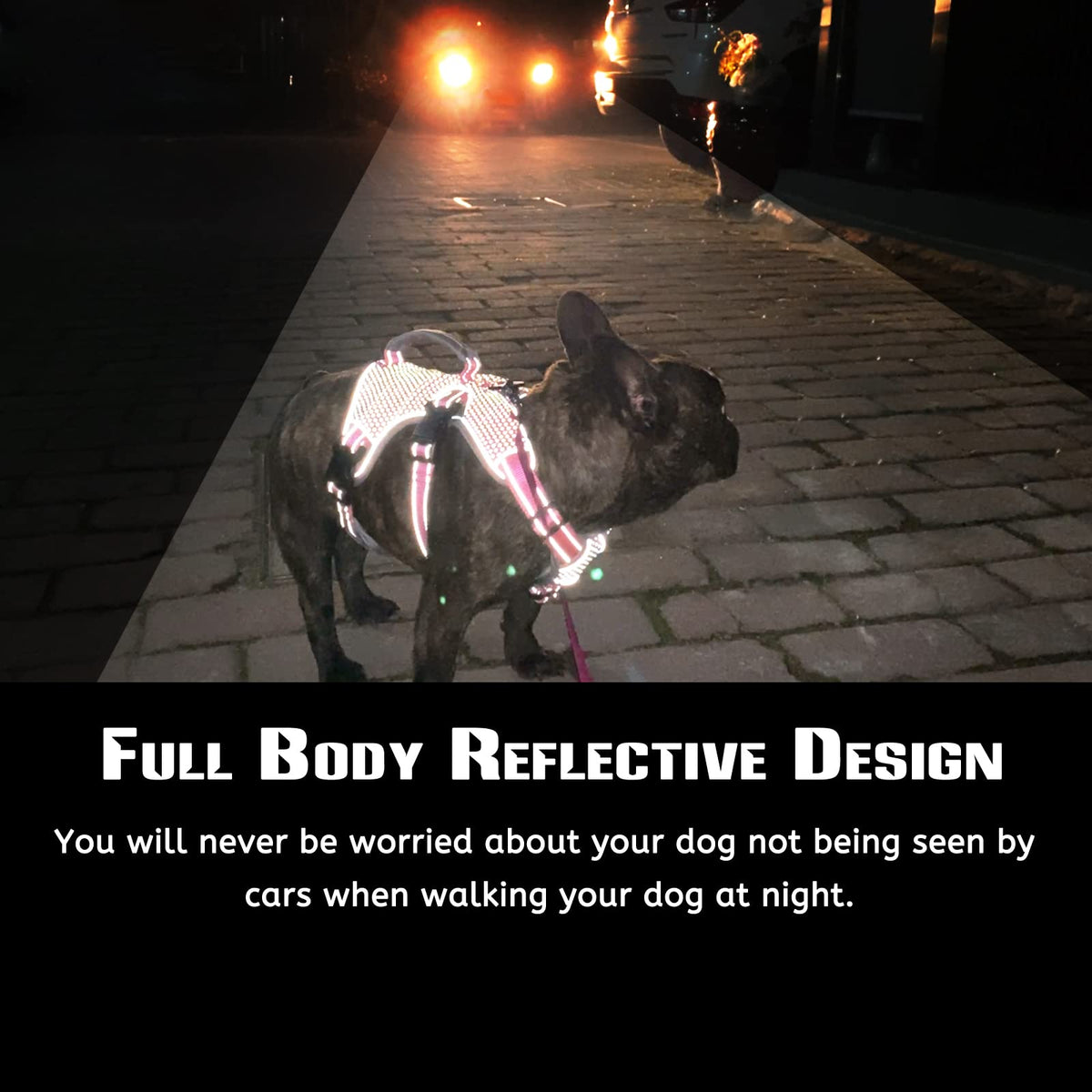 Q: How does the reflective feature enhance safety during walks?A: The full-body reflective design of the harness ensures that your dog is visible to vehicles and pedestrians during low light conditions, providing added safety during nighttime walks.