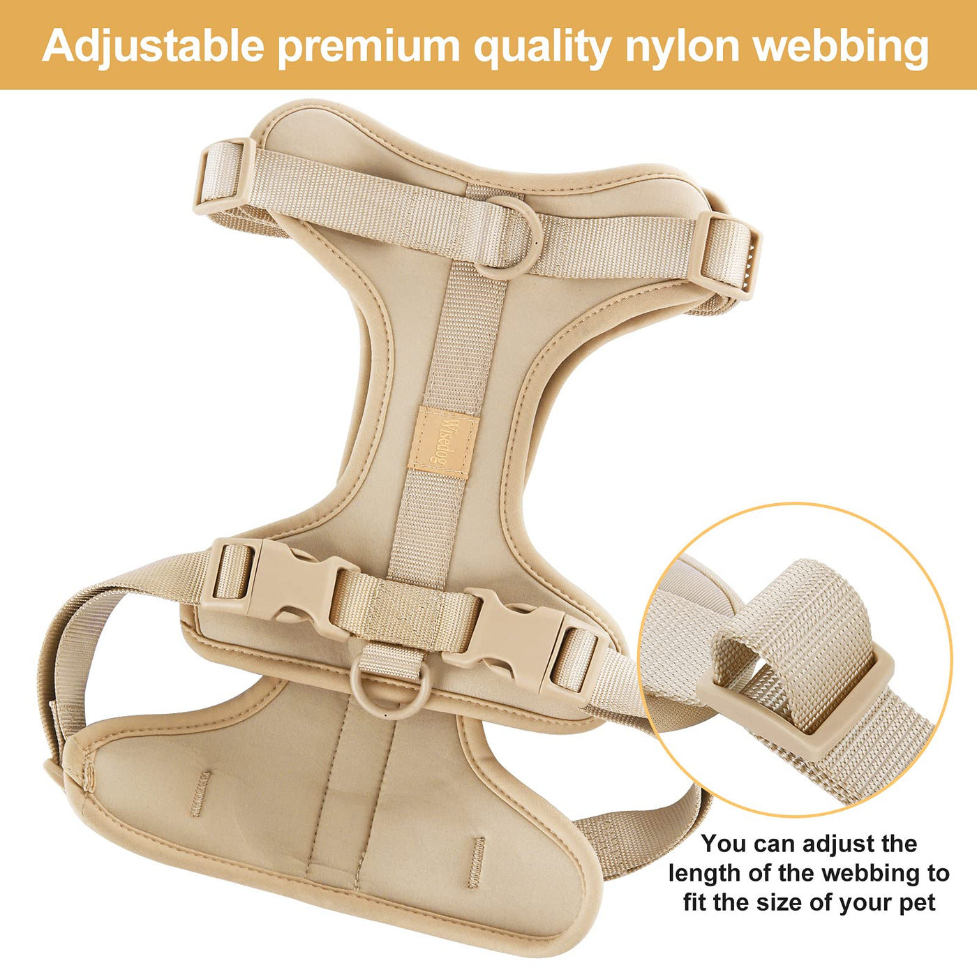 Q: How do I adjust the harness for my dog?A: The harness features adjustable premium quality nylon webbing that allows you to customize the fit around your dog's neck and chest. Simply loosen or tighten the webbing to ensure a comfortable and secure fit for your pet.