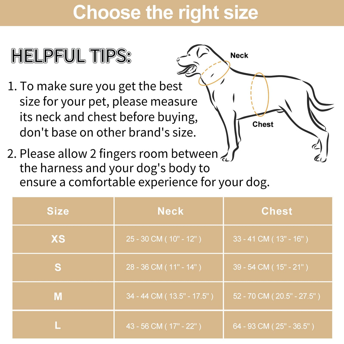 Comfortable and cushioned:The harness is made of Special scuba knitting fabric,soft and comfortable to touch, wrinkle free, good elasticity, with strong water and sweat absorption, to give your pet better experience. Adjustable premium quality nylon webbing:You can adjust the length of the webbing to fit the size of your pet. 3 Leash Attachment Points:2 on the back, and 1 on the chest,you can also hold dog ID tags and waste bags,Provides you with max flexibility and control,for your pet Outdoor Walking, Hiking and Traveling. Simple to Secure:This pet harness is easy to wear with 2 plastic quick release buckles,for the convenience of putting on or taking off. To make sure you get the best size for your pet, please measure his neck before choosing a size and then check the size chart.