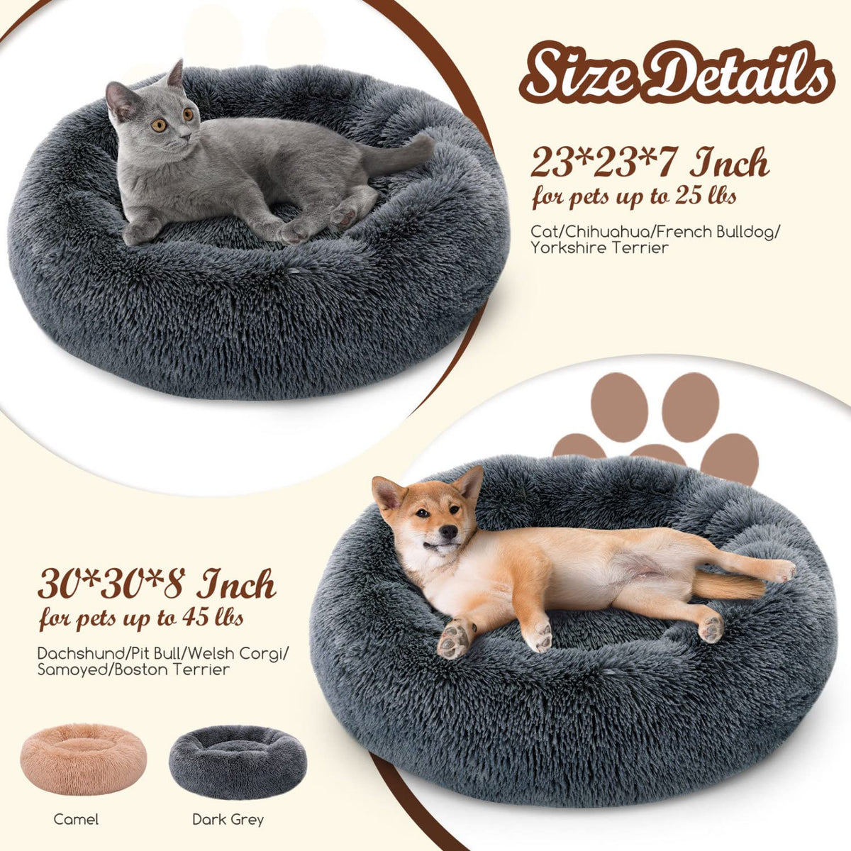 Nobelza Cat Bed Is Available In 2 Sizes For Choice, Suitable For Cats And Small Medium Dogs Usage, Such As Dachshund, Pit Bull, Welsh Corgi, Samoyed, Boston Terrier, Chihuahua And Papillon, French Bulldog, Etc. Notice: Please Note That Measure Your Pet'S Size And Refer To The Size Chart To Choose The Optimal One Before Placing The Order. Features: Round Donut Design Nobleza Dog Donut Bed Can Better Create A Full Sense Of Security, Suitable For Pets That Like To Curl Up In A Tight Ball. Soft & Cozy Nobleza Frenchie Dog Bed Is Covered In Long Flurry Faux Fur While The Interior Is Filled With Thick Pp Cotton, Which Is Super Soft And Comfortable. Anti-Anxiety Cat Bed Bolstered Edges All The Way Around Allow Pets To Curl Up And Sink Into The Bed, Helping Pets To Calm Down And Ease Anxiety To Enter Deep Sleep Faster. Self Warming Nobleza Circle Dog Bed Has A Self-Warming Feature, Which Can Reflect Pets' Own Body Heat Back To Themselves And Keep Them Warm And Cozy. Anti-Skid Bottom The Non-Slip Bottom Can Better Add Stability To Avoid Moving When Sleeping And Playing. Machine Washable Nobleza Fuzzy Dog Bed Can Be Machine Washed. Just Need To Be Machine Washed In Cold Water And Dried At Low Temperature, Greatly Saving Your Time And Energy. Specifications: Material: Long Flurry Faux Fur Available Color: Dark Grey / Camel Available Size: 23*23*7 Inch / 30*30*8 Inch