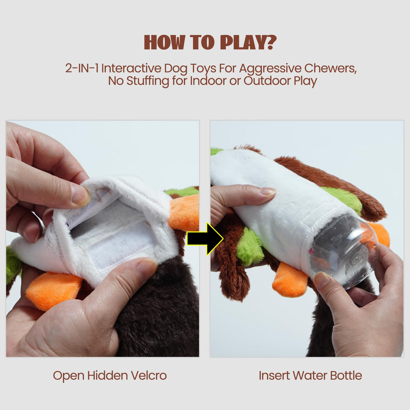 Q: Can these toys help with my dog's anxiety?A: Yes, the Nocciola dog toys can effectively help relieve your dog's anxiety. The engaging sounds from the squeaker and crinkle paper, combined with the ability to insert a plastic bottle for added crunch, keep your dog entertained and mentally stimulated.