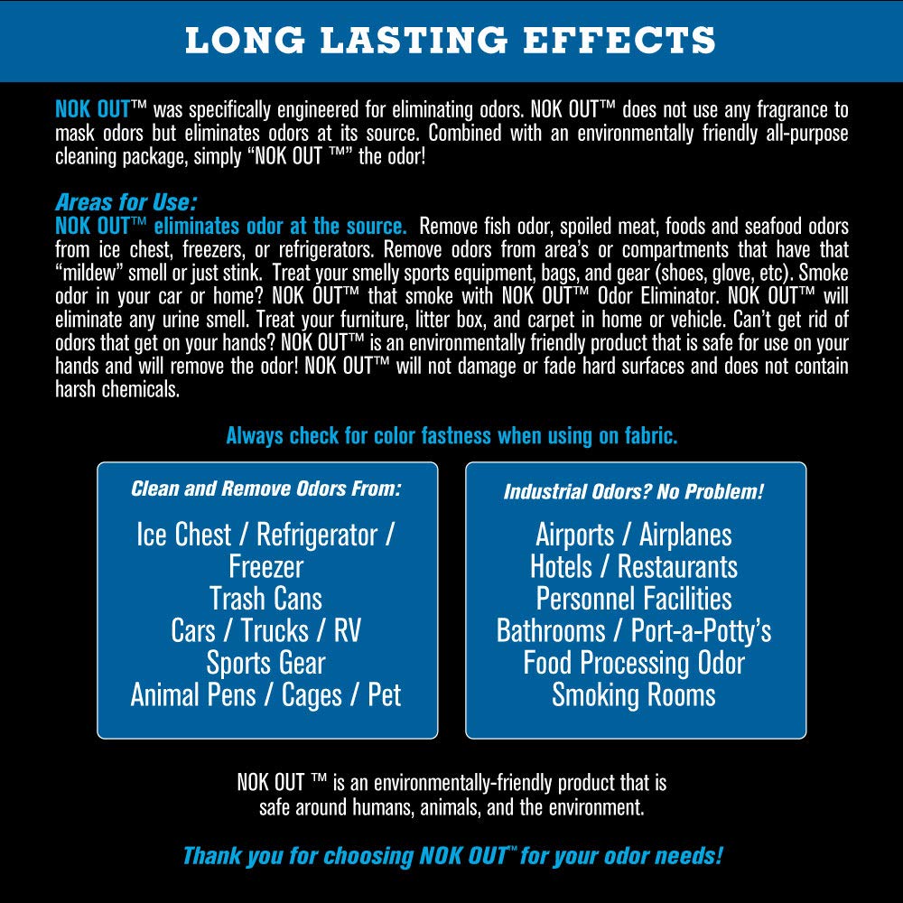 Q: How do I use Nok Out Odor Remover effectively?A: Simply spray Nok Out Odor Remover directly on the source of the odor without rinsing afterward. It works immediately to break up dirt, light oil, and grime, and can also be used as a pre-wash treatment.