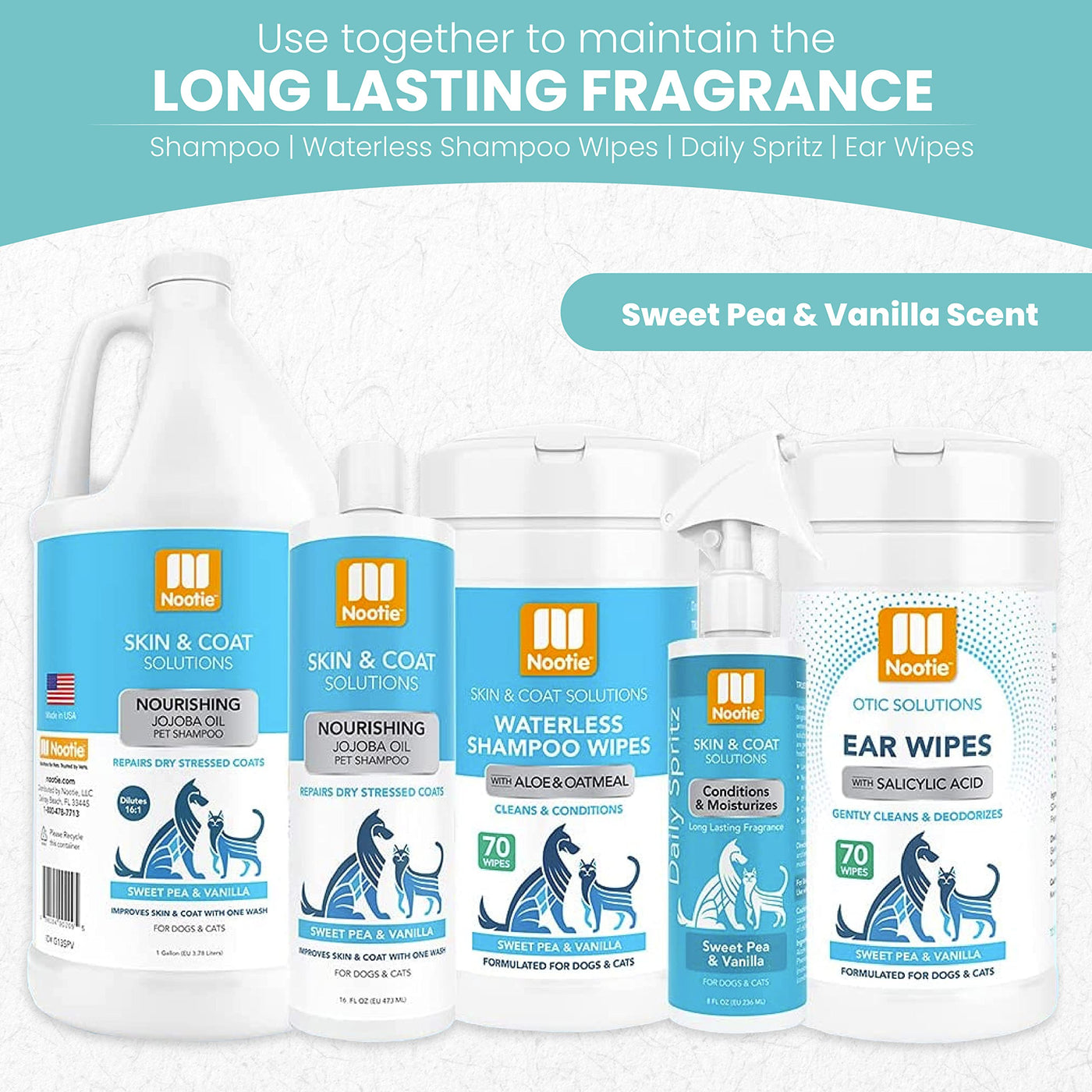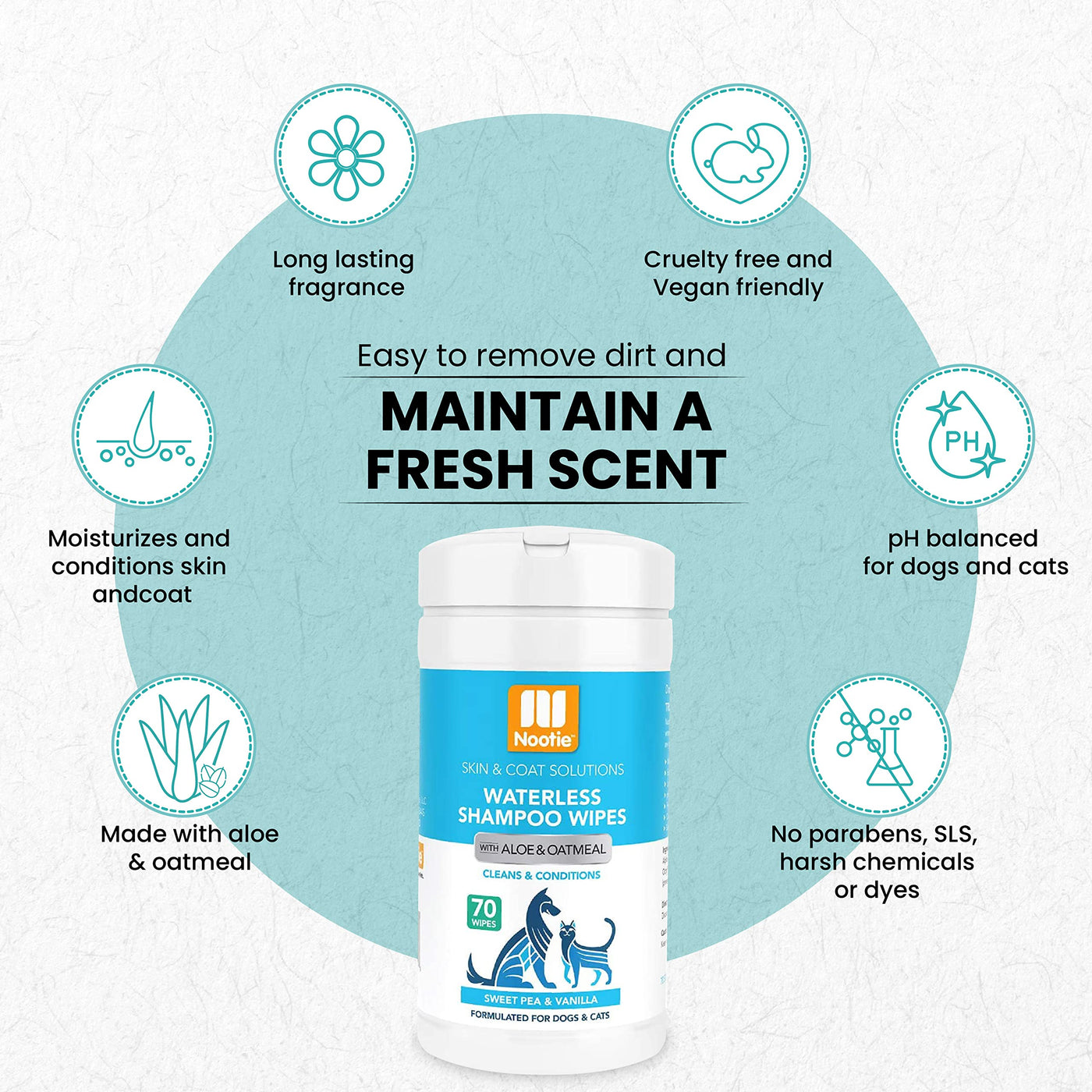 Keep Your Pet Clean And Smelling Fresh Between Baths With Nootie Waterless Shampoo Wipes. These No-Rinse, Alcohol-Free, Deodorizing Pet Wipes Have A Sweet Floral Sweet Pea And Vanilla Fragrance That Will Keep Your Dog Or Cat Smelling Great! Our Formula Contains Active Cleansing Ingredients Plus Fur-Softening Glycerin And Soothing Aloe And Oatmeal To Clean And Condition Your Pet'S Skin And Coat. Nootie Pet Shampoo Is Ph Balanced For Dogs And Cats, And Is Free From Any Parabens, Sls, Harsh Chemicals, Or Dyes That Can Cause Skin Irritation. Nootie Products Are Made In The Usa And Sold In Over 10,000 Vet Clinics And Pet Stores Worldwide.