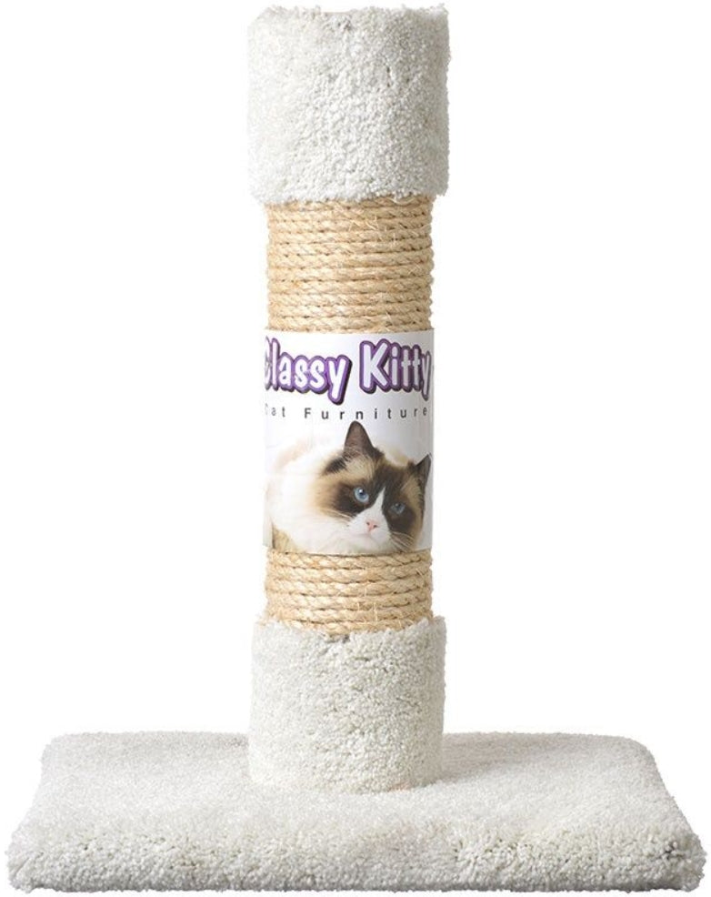 Q: What materials are used in the construction of this scratching post?A: This scratching post is primarily constructed from sisal rope, which is a preferred texture for cats, and features a thick, catnip-treated carpet that outlines the sisal for added enjoyment.