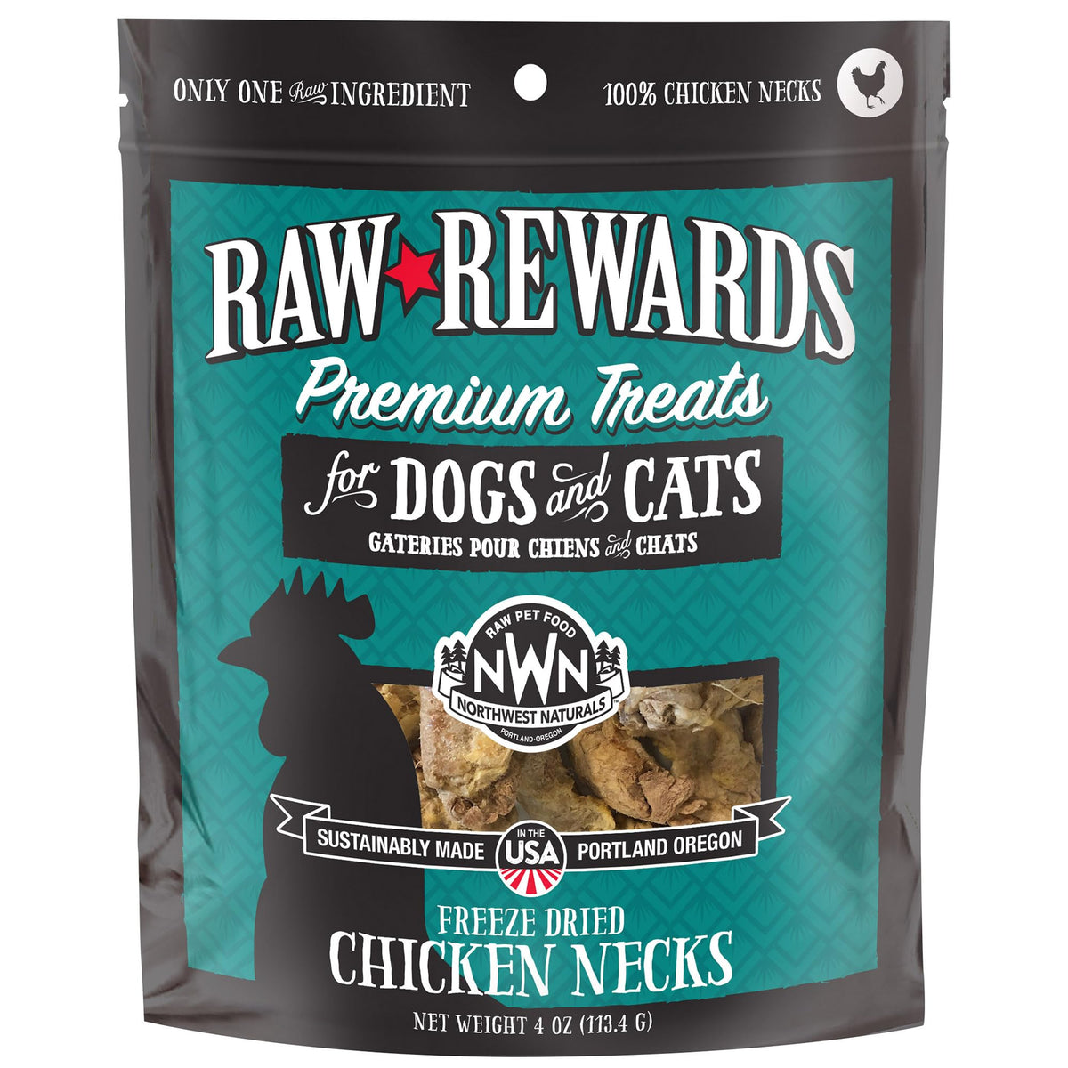Northwest Naturals Raw Rewards freeze-dried Chicken Necks. A natural source of protein, fat and minerals that can be added to your pets daily diet or as a treat. Cats love freeze-dried necks too.