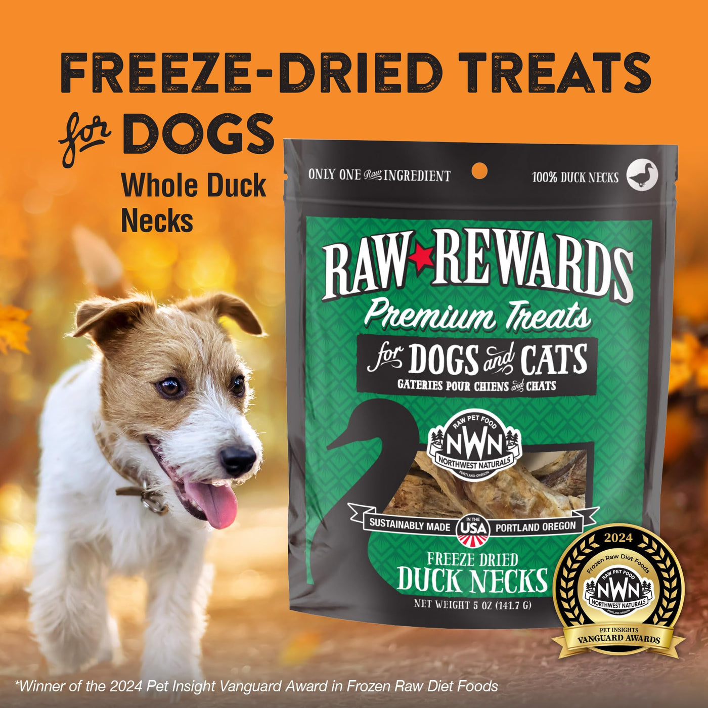 Northwest Naturals Raw Rewards freeze-dried Duck Necks. A natural source of protein, fat and minerals that can be added to your pets daily diet or as a treat. Cats love freeze-dried necks too.