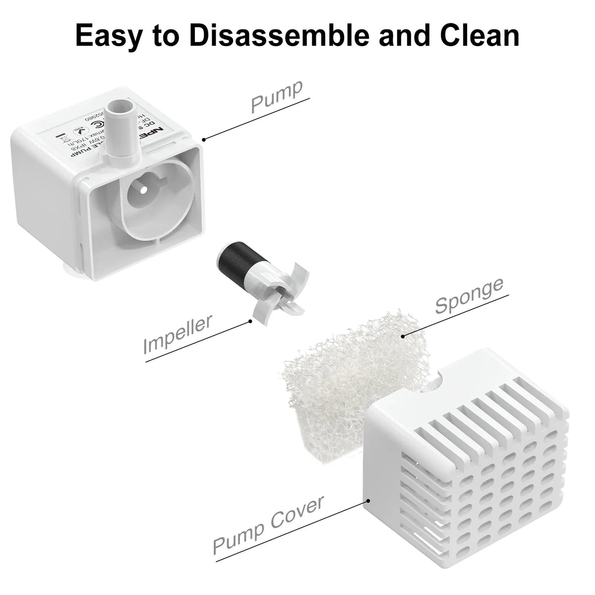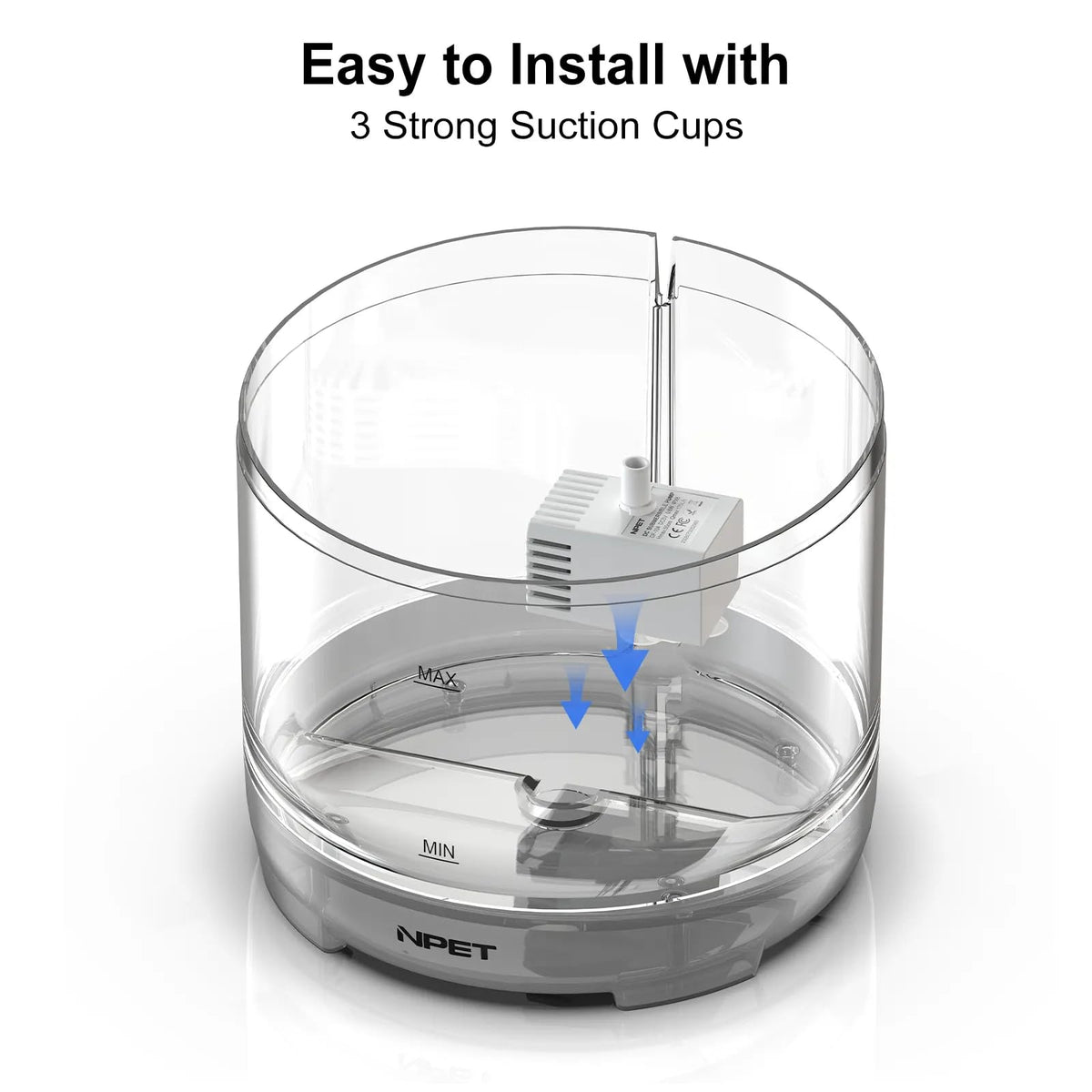 Q: How quiet is the NPET Pet Water Fountain pump during operation?A: The NPET Pet Water Fountain pump operates quietly, with a noise level measured below 40 dB. This ultra-quiet motor allows you and your pets to enjoy a peaceful environment without disruptive sounds.