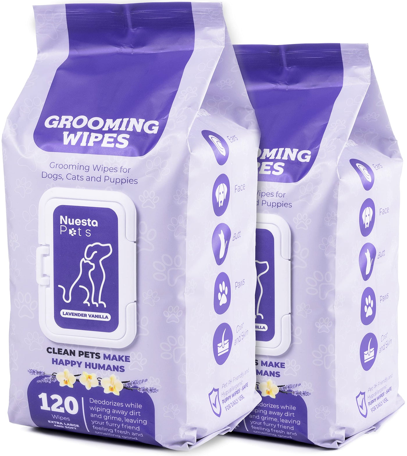 Nuesta Pets extra large and thick no rinse pet wipes for dogs and cats are a naturally derived, plant based and handy daily pet grooming solution for cleaning and deodorizing your furry friend. Hypoallergenic, pH balanced and deodorizing, our lavender vanilla grooming wipes are formulated to actually break down & destroy odors while moisturizing and rebalancing microflora on the skin. A safe rinse free option for you and your pet! Extra large soft & gentle measuring a full 8x12 inches and 3x thicker than standard baby wipes. Great for use on the entire body including paws and butt, as a coat deodorant or just the occasional muddy and smelly paws and butt. A great waterless bathing alternative for cats dogs and puppies, and for a quick clean up when getting home from the daily walk. Wipes away dirt and grime and helps relieve itching leaving your furry friend feeling fresh and smelling good. You will receive 2 packs of 120 extra large, thick & soft grooming cloth wipes for Dogs, Cats, Puppy Wipes and Kittens. Our dog cleaning wipes & cat wipes can also be used on face, wrinkles ect.