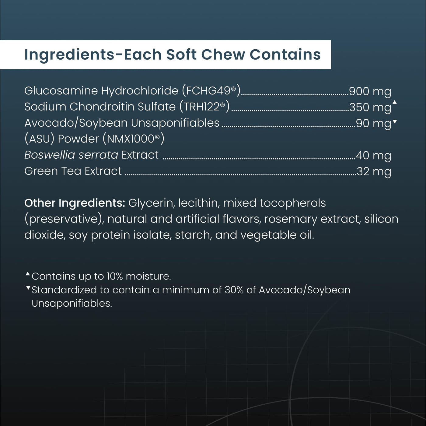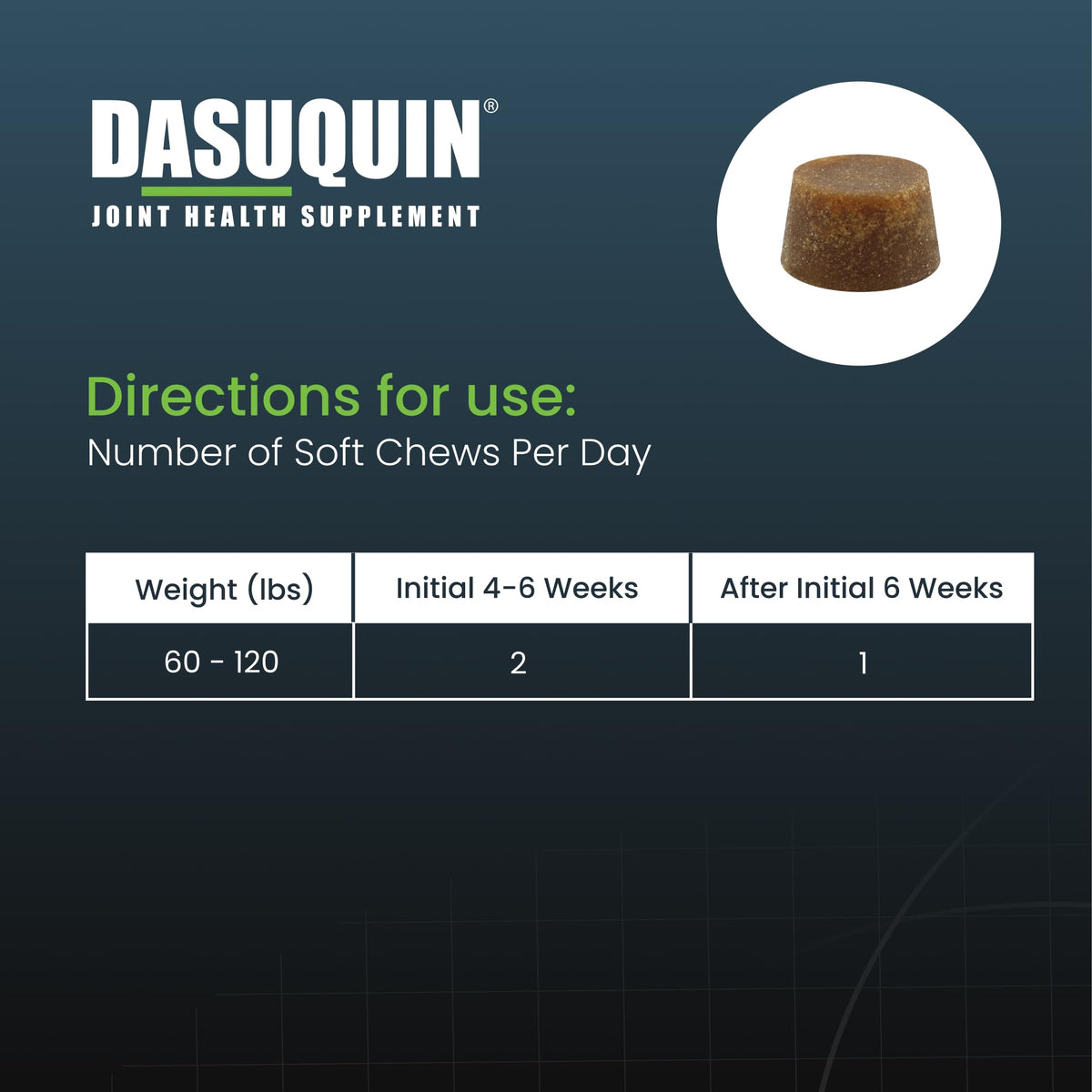 Dasuquin Soft Chews for Large Dogs is a premium joint health supplement that contains a combination of glucosamine hydrochloride, chondroitin sulfate and avocado/soybean unsaponifiables (ASU) to help support your pets joints. In fact, research has shown that the combination of glucosamine, chondroitin sulfate, and ASU works better than glucosamine and chondroitin sulfate alone! Dasuquin joint health supplements are brought to you by Nutramax Laboratories Veterinary Sciences, the #1 veterinarian recommended supplement company. ?Source: Among veterinary brands. Survey conducted among small animal veterinarians who recommended oral joint health supplements. *Source: Survey conducted among small animal veterinarians who recommended animal supplements.