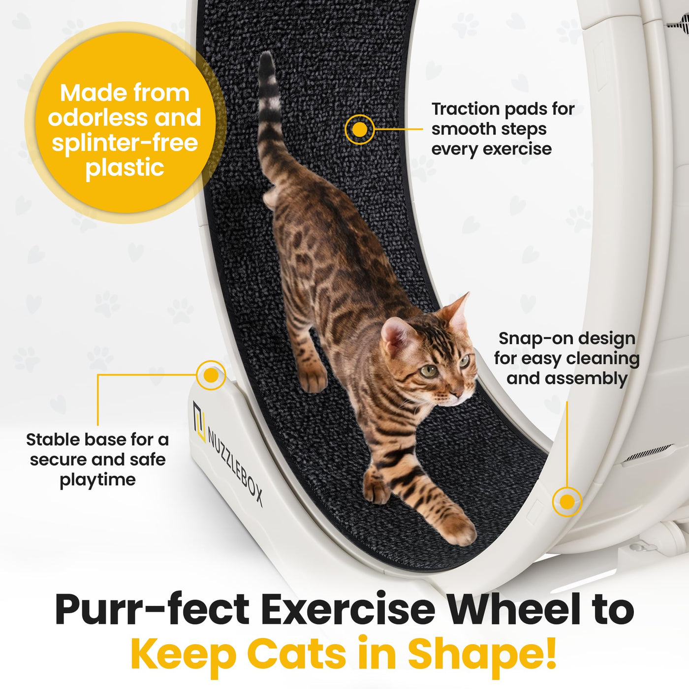 Give Your Cat The Joy Of Play And Exercise With The Nuzzlebox Cat Treadmill For Indoor Cats - An Innovative Addition To Any Home That Promotes Health And Happiness For Your Beloved Pet! Our Cat Running Toy Has A Chic White Finish That Complements Any Space In Your Home, Whether It'S Your Bedroom, Living Room, Or Any Other Room. What'S Even Better? This Set Includes A Cat Teaser That Lets You Entertain Your Paw Pal And Encourage Them To Run Or Walk On The Cat Exerciser, Which Also Helps Strengthen Your Bond. Whether You Have A Ragdoll Kitten, A Maine Coon Adult, Or A Persian Senior, Our Cat Furniture For Indoor Cats Caters To Their Sizes And Breeds. They Will Experience Smooth Steps Thanks To The Traction Pads, And This Cat Pet Activity Structure Won'T Wobble Or Topple On Any Surface Thanks To The Stable Base. Now, Witness Their Weight Improve, Digestion Enhance, Minds Sharpen, And Overall Health Boost! Simply Snap All Parts Of Our Cat Weight Loss Running Supplies Together To Assemble It, And You'Ll Never Worry About Those Splinters And Odors In The Process, As We'Ve Equipped It With Pp Plastic. When Your Paw-Friend Decides To Rest, Hold Its Wheel Using Its Fish-Shaped Safety Lock, And Make Sure To Wipe It Clean When You See Dirt Or Any Stain So You Can Give Your Furry Pal A Hygienic Space. Nuzzlebox Is Dedicated To Enhancing The Lives Of Indoor Cats By Providing Innovative Ferris Cat Wheel Solutions That Cater To Their Natural Instincts. We Understand That Indoor Cats Often Lack Sufficient Physical Activities, Which Can Lead To Health And Behavioral Issues. Our Mission Is To Transform The Lives Of Cats And Their Owners By Introducing Engaging And Safe Ways For Felines To Exercise, Play, And Explore Within The Comfort Of Their Homes. Help Your Cat Live Their Best Life With The Nuzzle Box Animal Wheel Cat Accessories For Indoor Cats By Clicking 'Add To Cart' Now!
