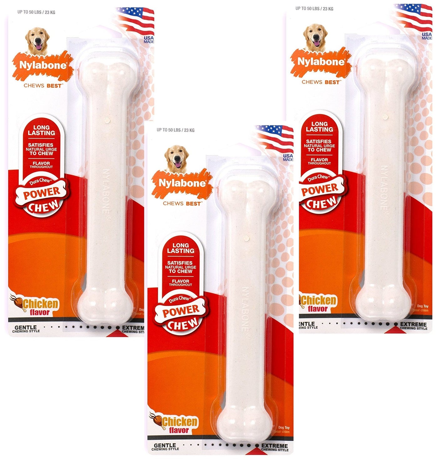 Pack Of 3 Nylabone Dura Chew Giant Chicken Flavored Bone Dog Chew Toys. Give Your Dog Something Good To Chew On. Made With Tough, Durable Nylon, The Nylabone Durachew Bone Ultra Long-Lasting Dog Chew Toy Was Designed For Powerful Chewers. Our Flavorful Dog Chew Toy Provides Long-Lasting Enjoyment, Satisfies The Natural Urge To Chew, And Encourages Positive Chewing Habits. Plus, The Bristles Raised During Chewing Promote Clean Teeth And Help Control Plaque And Tartar Buildup. (Different Dogs Have Different Chewing Styles And Strengths, Even Within The Same Breed, So Be Sure To Choose The Correct Chew Size And Type For Your Dog.) Made In The Usa.