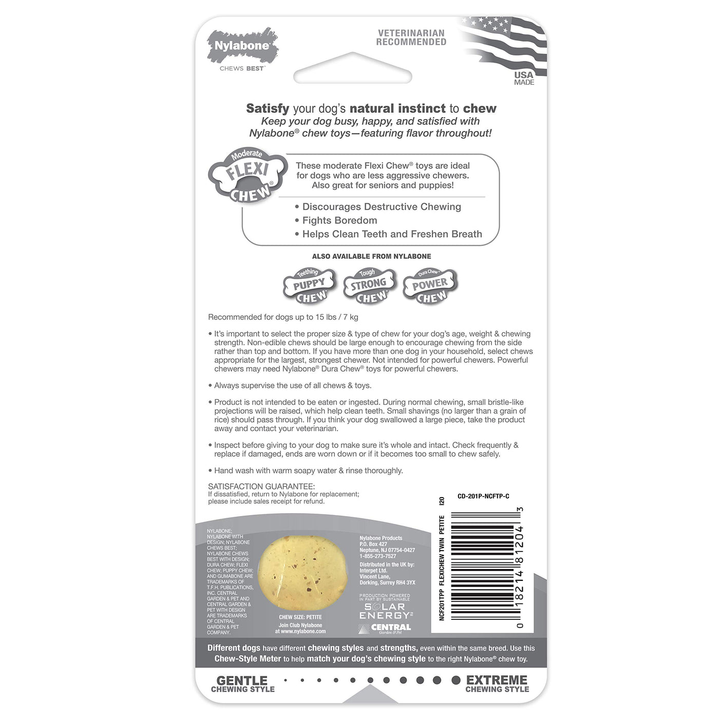 This twin pack comes with one chicken-flavored and one original-flavored FlexiChew Bone. Nylabone FlexiChew chew toys are made from softer material for moderate chewers. The FlexiChew Bone keeps dogs entertained, and the bristles raised during chewing promote clean teeth and help control plaque and tartar buildup. Not recommended for strong chewers. (Different dogs have different chewing styles and strengths, even within the same breed, so be sure to choose the correct chew size and type for your dog.)