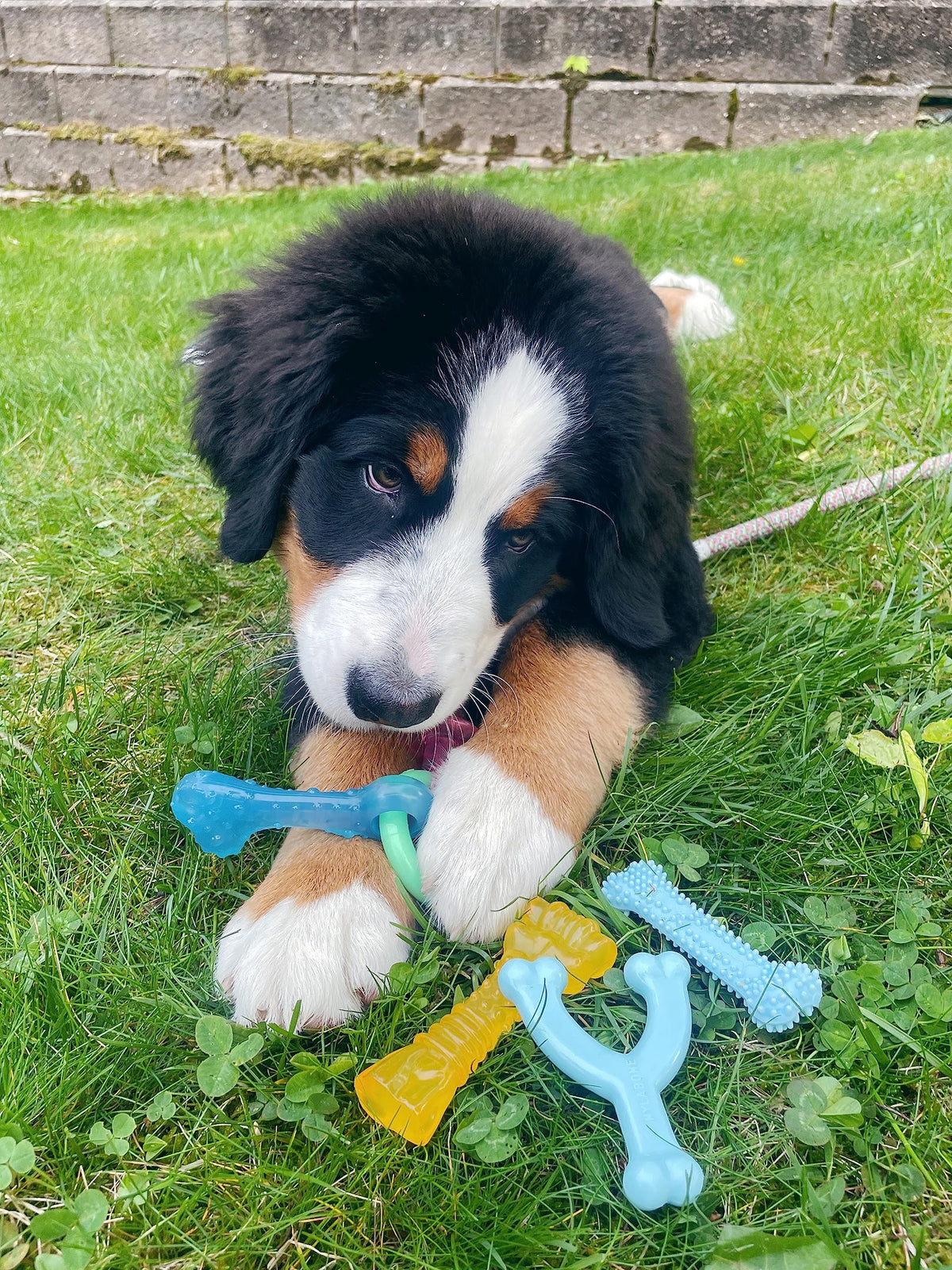 As the leader in dog chew toys for over 60 years, Nylabone knows growing pups need to satisfy their urge to chew! The Nylabone Puppy Chew Toy Bundle features 4 chew toys in a variety of shapes, textures, colors, and flavors to encourage healthy chewing habits from a young age. Made of softer material, these puppy teething toys are specifically designed to help relieve teething discomfort while providing an engaging activity. The pacifier chew toy features two entertaining bacon-flavored pacifiers with raised nubs that massage gums and help clean teeth. For an extra-soothing chewing experience, the delicious lamb and apple flavored chew toy turns a bright orange color when frozen and provides much-needed comfort as pups chew. Another fun option that can also be placed in the freezer, the flexible bone chew toy has a satisfying textured surface that feels great on pups gums. Lastly, the Puppy Chew wishbone includes three exciting chewing ends to keep pups occupied. Give your little furry friend the teething relief they need with this fulfilling puppy bundle!What your dog chews matters! With destructive behavior among the leading reasons dogs are returned to shelters, we know healthy habits can make a life-changing difference. For 70 years, our family-founded brand continues to safely satisfy dogs chewing instincts and help them stay in loving forever homes!