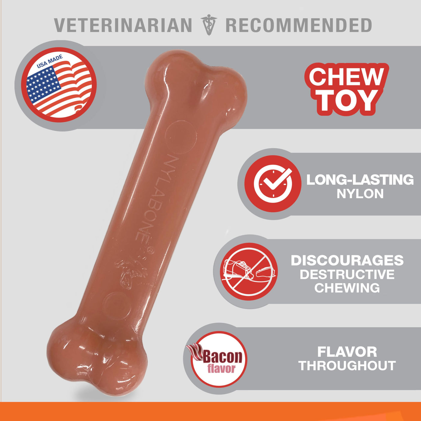 ABOUT POWER CHEW TOYSMade from our toughest nylon material, Power Chew toys challenge even the most extreme chewing styles! These durable dog chew toys for aggressive chewers come in many different shapes and enticing flavors to discourage destructive chewing, help clean teeth, and simply keep dogs happy!DOUBLE THE FLAVOR, DOUBLE THE CHEWINGThis twin pack features 2 long-lasting Power Chew toys: 1 in irresistible bacon flavor and the other in savory chicken flavor. Designed in a classic bone shape dogs love, these USA-made dog chew toys are sure to satisfy your best friends natural instinct to chew.GUARANTEED YOUR DOG WILL LOVE ITBefore we introduce new dog products to furry friends and pet parents everywhere, we make sure our very own dogs love them first! If youre not happy with your Nylabone chew toy for any reason, simply return it to us with the sales receipt for your money back. Or, reach out to our Consumer Care team so we can help make it right (and talk about how much we also love our dogs).MEET NYLABONE - THE CHEWING EXPERTSWeve been making the very best chewing solutions since 1955, so we know a thing or two about CHEW! Fast-forward 60+ years and pet parents continue to trust our family-founded company for high-quality chew toys, tasty treats, fun play toys, and easy-to-use dental products. To put it simply: Nylabone Chews Best.