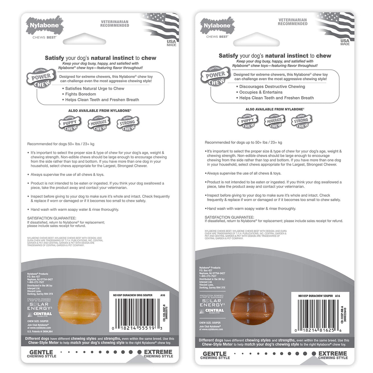 Nylabone has been the pet industry leader for more than 60 years, satisfying dogs' natural urge to chew with the very best chew toys. Intended for the most aggressive chewers, this Power Chew bundle includes a pair of long lasting nylon dog bones with flavor throughout that will entertain your four-legged friend. Each multi-textured chew toy comes in a classic Nylabone Souper shape and features fun ridges and nubs that promote clean teeth through chewing action. Satisfy your fur friend's natural urge to chew and encourage healthy, non-destructive behavior with this USA-made dog chew toy bundle!