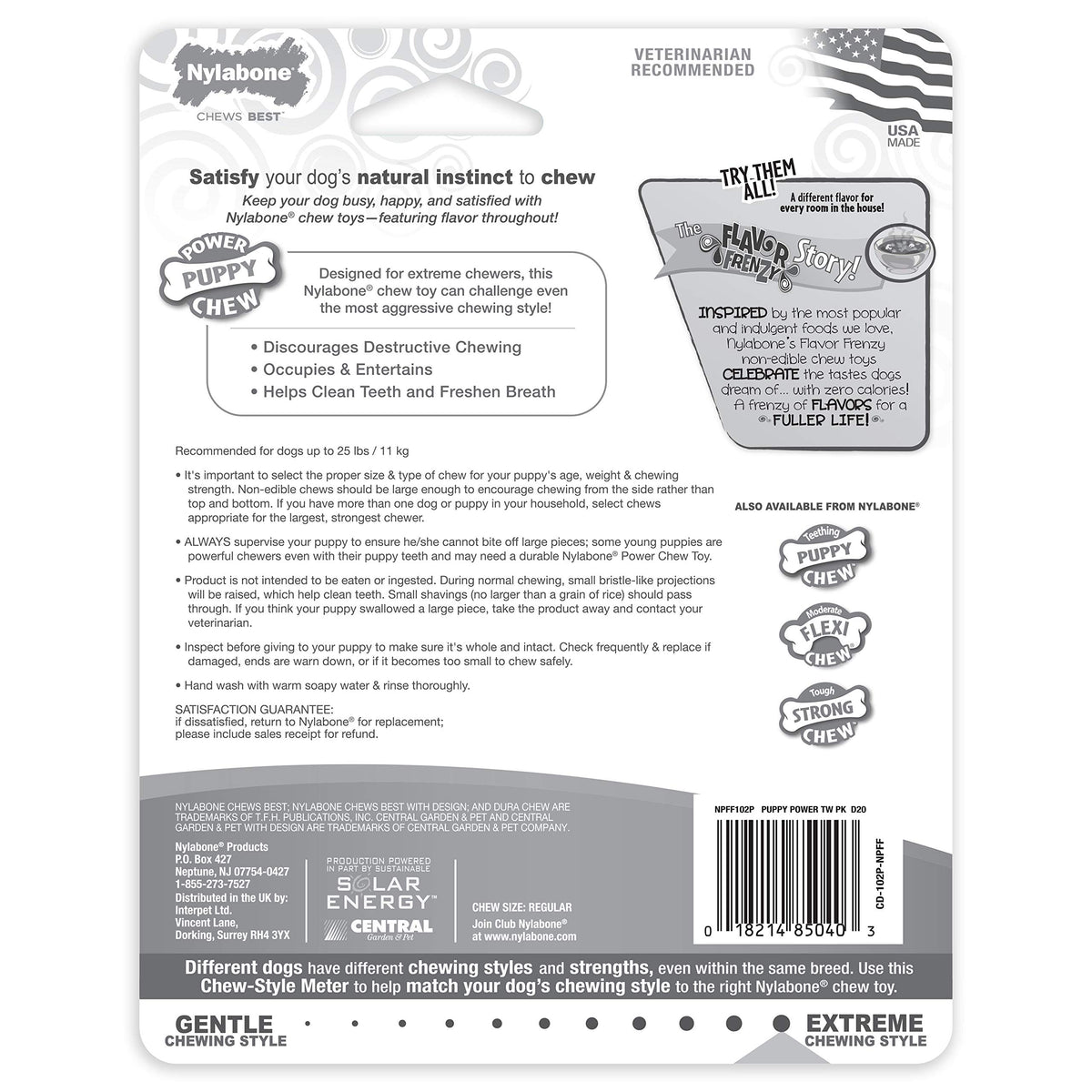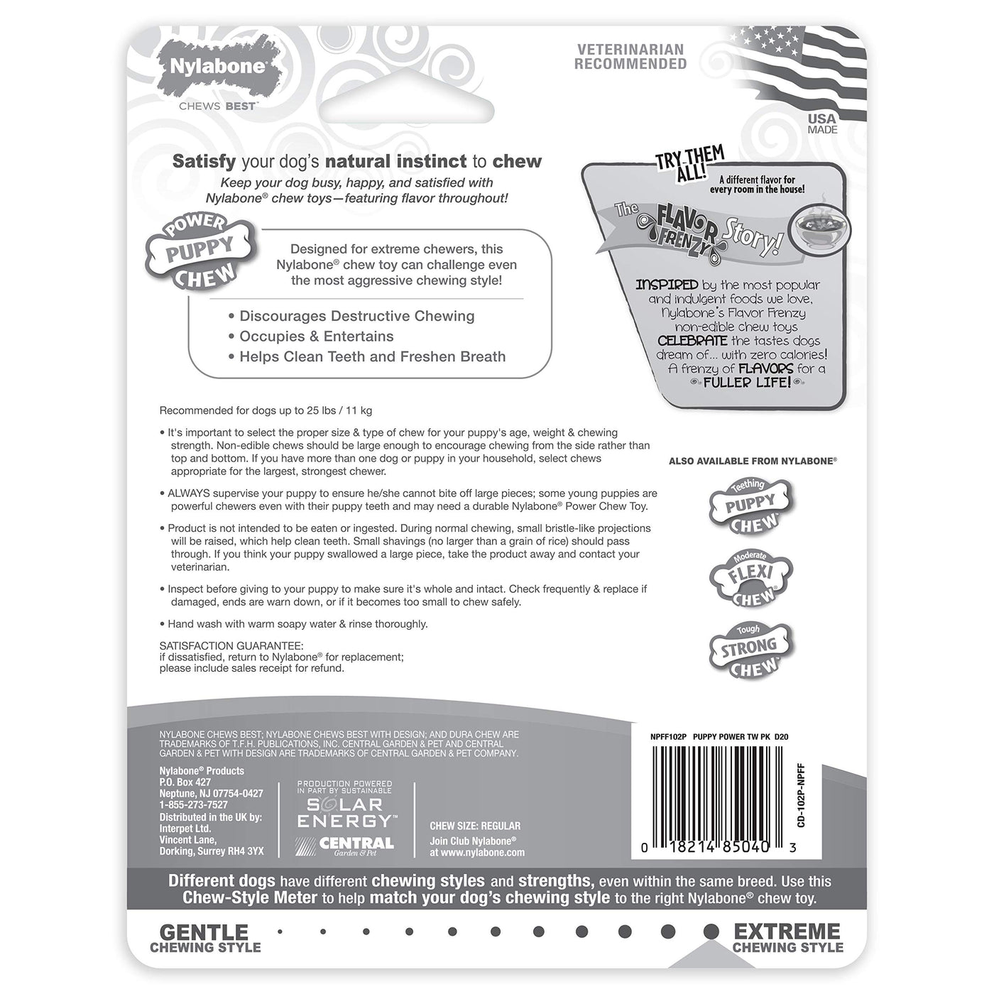 Q: How long do these chew toys last for power-chewing puppies?A: While durability can vary by individual puppy chewing habits, the Nylabone chew toys are designed to withstand the chewing of power-chewing puppies, providing long-lasting entertainment and satisfaction.