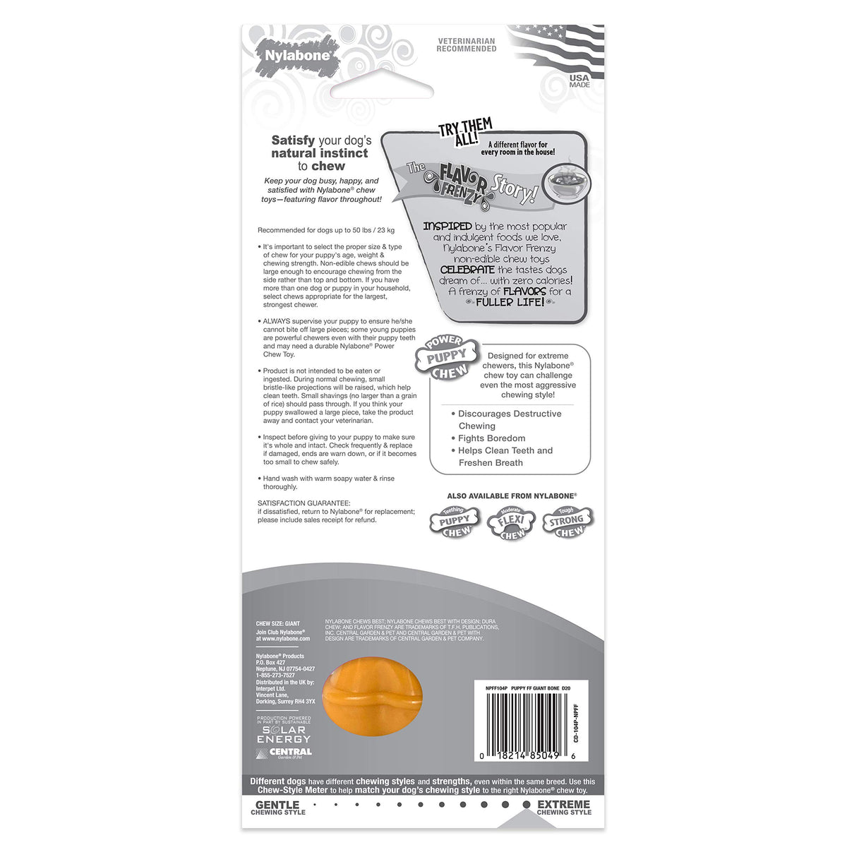 This Puppy Power Chew toy will keep your new fur friend occupied while teaching healthy, non-destructive chewing habits that will last a lifetime. Made of durable nylon, our long-lasting chew toy is intended for teething puppies who are more powerful chewers or have their adult teeth. The puppy chew bone also features ridges and nubs that help clean teeth and freshen breath through chewing action, giving your pup a fun and stress-free way to help maintain their dental health. Satisfy your growing dog's natural urge to chew with thus USA-made puppy chew toy!
