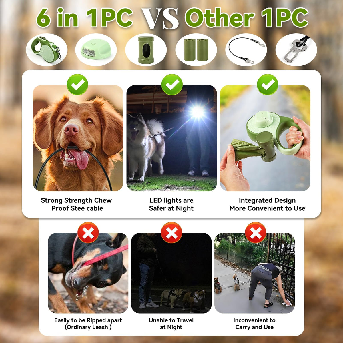 Who Is Odriew? We Have World-Class Designers! We Love This Job Very Much. Because Pets Are Man'S Best Friend, It Is Our Greatest Wish To Let Pets Grow Up Healthily And Happily. Why Recommend This Retractable Dog Leash? This Upgraded 26Ft Heavy-Duty Retractable Dog Leash, Equipped With Led Light, Detachable Dispenser, 2 Rolls Of Poop Bags, 1 Chew-Proof Steel Cable And Car Safety Belt Clip, Integrates Almost All Functions Of A Retractable Dog Leash. The Perfect Combination Is Designed To Provide A Comfortable Travel Experience For You And Your Beloved Dog. 1. Led Light Suitable For Nighttime Environment And The Light Is Not Bright Place. Gives You Maximum Visibility And Safety While Walking Dog. 2. Detachable Dispenser It Comes With Dog Poop Bags So You Can Quickly Clean Up The Mess Left By Your Dog In Those Untimely Occasions. Easy To Walk The Dog. 3. 360 Tangle-Free Design U Retraction Opening Design And Guided Retraction System Make Retraction Easy And Smooth, Allowing You To Control Your Dog From Any Angle. High Durability Internal Coil Move Through Strong Pull Without Jamming. 4.Anti-Chew Cables And Car Seat Belt Clips It Can Be Used With A Retractable Leash To Prevent Dogs From Chewing Off The Leash, Or It Can Be Used To Secure Your Dog To A Car Seat Alone. The Entire Steel Cable Is 21.5In Long, 2In In Diameter, And Has A Maximum Load-Bearing Capacity Of 300Lbs. Cautions: Do Not Try To Open The Plastic Casing Or Disassemble Any Other Parts, The Spring Inside May Cause Unexpected Injuries. Do Not Hold Or Grab The Tape And Do Not Allow The Tape To Become Wrapped Around Parts Of The Body, You May Get Hurt. If You Have A Dog That Likes To Chew, Please Put The Anti-Chewing Steel Cable At The End Of The Leash, Which Can Perfectly Solve The Risk Of Being Bitten Off.