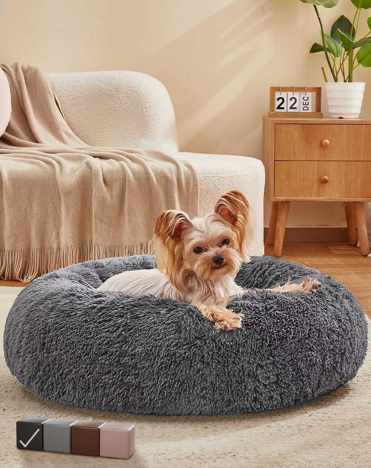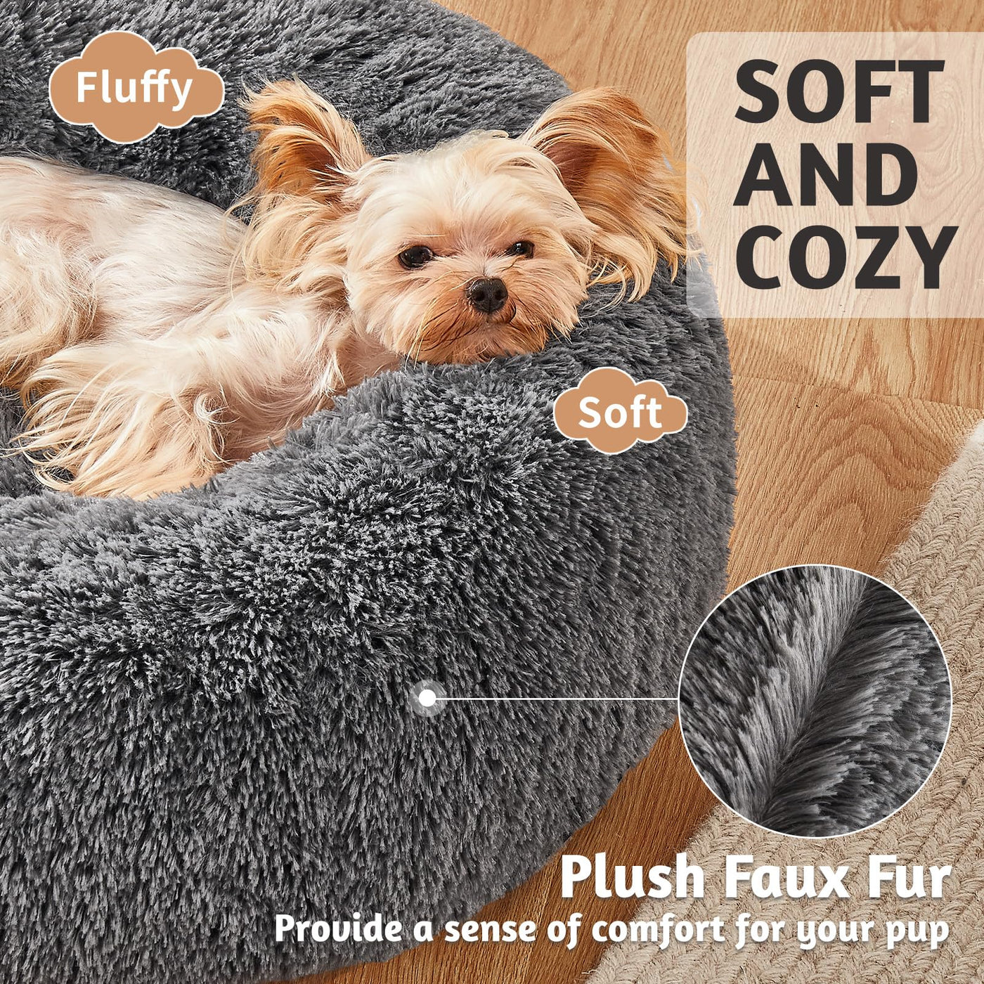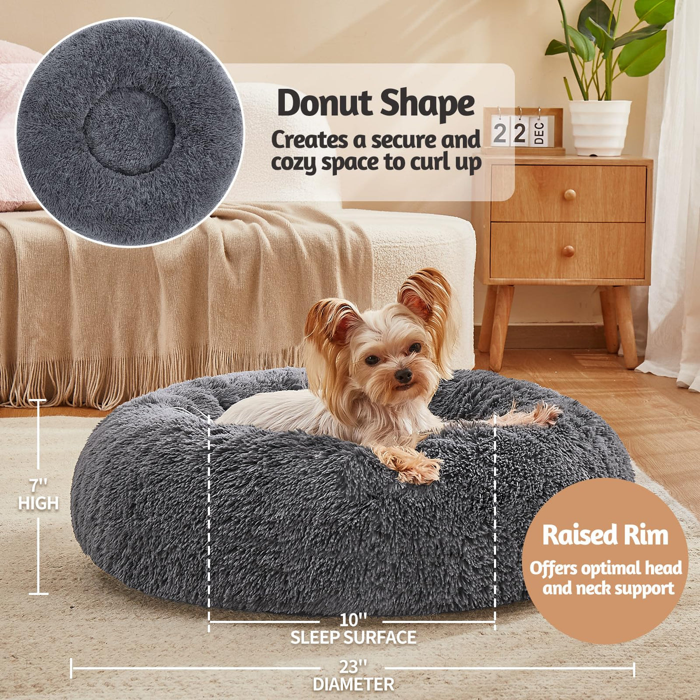 Ohgeni Calming Donut Dog Bed Pillow For Small Medium Pets, Machine Washable Removable Cover, Comfort Plush Fluffy Faux Fur With Anti-Slip Bottom, Cats-Friendly Round Cuddly Design, Gray, 23 Inches