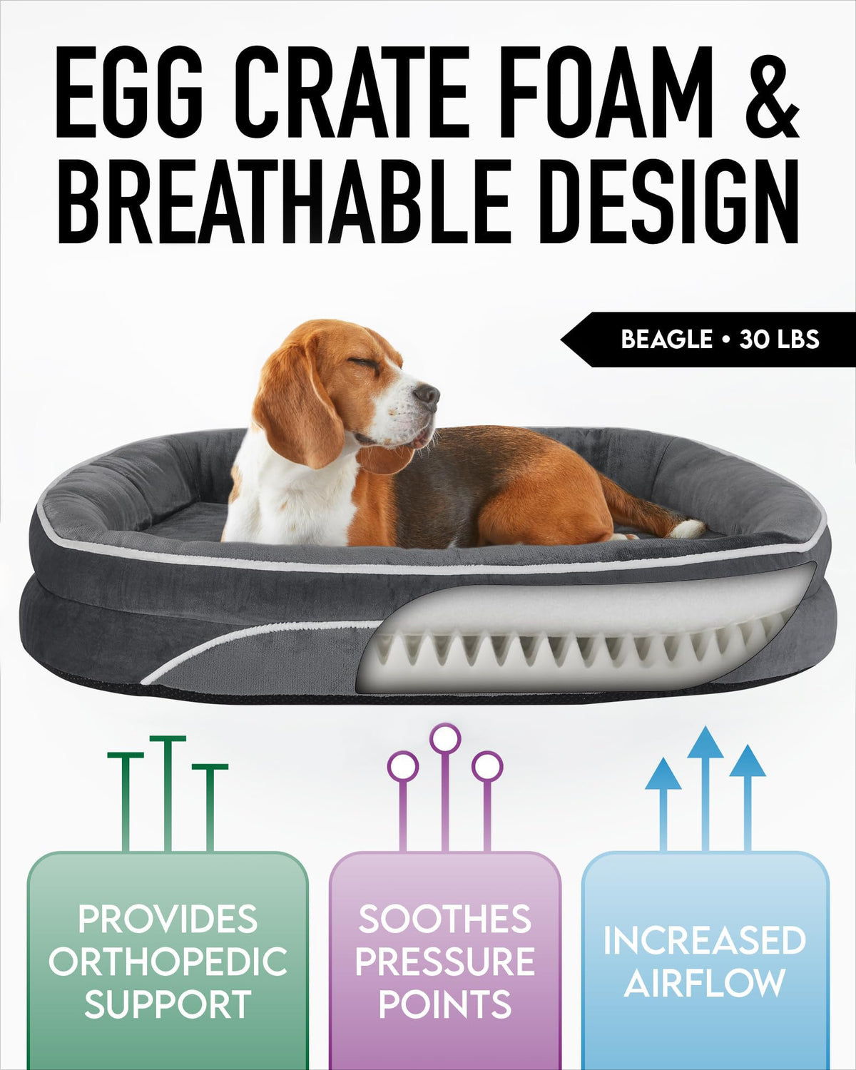 Egg Crate Foam Filling: Our orthopedic dog bed features egg crate filling, delivering exceptional softness and support compared to traditional foam beds. The 3” high cushion ensures even weight distribution, providing comfort for your dog’s joints. | Convenient Removable Cover: Our beds come with a removable zippered cover, making it effortless to remove and wash. The cover is constructed from durable and scratch-resistant fabric, ensuring longevity even with active or mischievous dogs. Wash the cover on a delicate cycle to enjoy longer! | Waterproof Inner Lining for Longevity: The smart and fully waterproof inner lining of our egg crate foam dog bed is washable, safeguarding the foam from pet urine, accidents, messes, and dust. This ensures the bed remains in excellent condition, even after your dog makes a mess. | Comfortable Fleece Fabric: Our dog beds boast an ultra-soft fleece fabric interior for the ultimate combination of comfort and breathability. This material offers superior protection against biting, scratching, clawing, and damage. | Secure and Cozy Environment: Our dog bed features plush side bolsters, offering your furry friend a safe and snug space for rest, promoting a sense of security. Help your pet pals feel contained and calm with our bolstered dog bed.