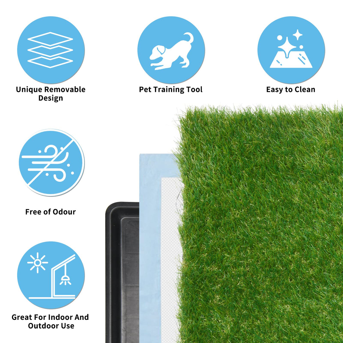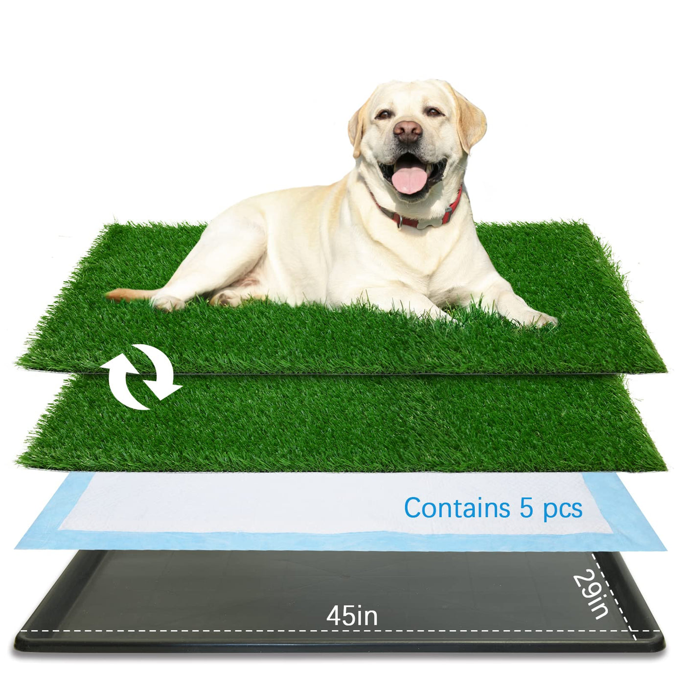 Oiyeefo Artificial Grass Pad Tray Oiyeefo Artificial Grass Pad Tray Apartment Dog Grass Puppy Training Pads, Realistic Soft Grass Pad Can Effectively Attract Dogs, There Is Also Leakage Holes In The Middle Of The Lawn, When The Dog Pee On The Dog Pad, The Leak Hole Can Timely Discharge The Urine To The Disposable Pad.The Disposable Puppy Pee Pad Catch The Urine And Absorb It Quickly, So The Extreme Odor-Causing Issues Can Be Easily Curbed,And There Is A Large Leak-Proof Tray At The Bottom To Protect Your Carpet And Floor.Drainage Holes Are Also Conducive To The Cleaning Of The Meadow, Just Rinse With Water, Clean The Lawn. At The Same Time, We Provide Two Meadows For Your Convenience That You Can Wash One While The Other Is Ready For Use. Indoor/Outdoor Bedpan Solution House Training Medium ,Large Dogs Or Older Dogs Arthritic Or Incontinent Dogs Owners With Busy Schedules Owners Who Have Difficulty Getting Outside Traveling With Dogs: Boats, Rv'S, Airplanes And Hotels Apartments Or Homes Without Yard,Patios, Porches Or Balconies Extreme Weather Conditions: Blizzards, Rain, Snow, Hurricanes And Heat Feature Large Dimensions: 45*29 Inch 2-Packs Replacement Grass Turf 5 Replaceable Disposable Changing Pads Realistic Soft Artificial Grass Easy For Cleanup With Water Rinse Set Include 2 *Grass Mat 5*Disposable Pee Pads 1*Base Tray Dimensions: 45''*29''
