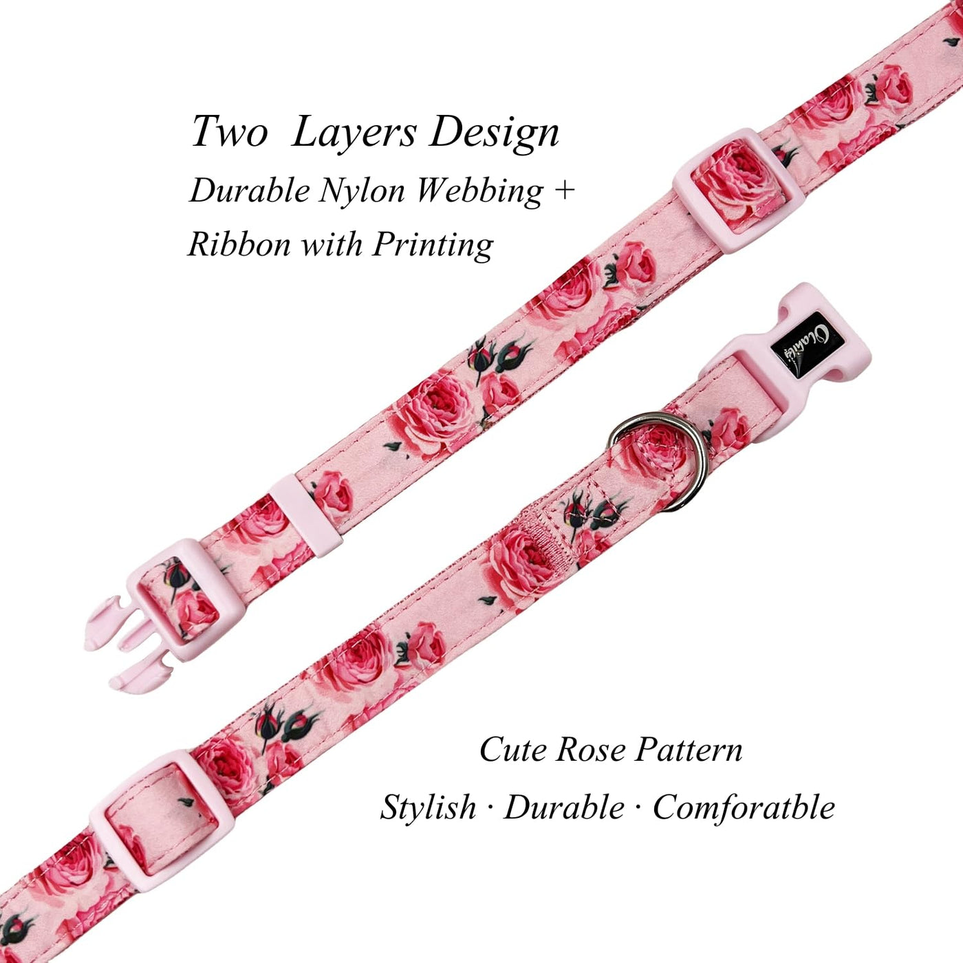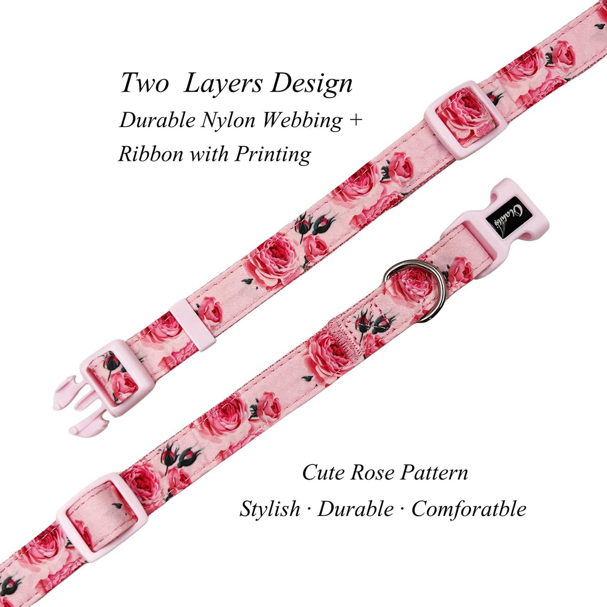 Olahibi Dog Collar Leash Set, Floral Pattern, Nylon Webbing Plus Cotton Ribbon, 5Ft Matching Leash, For Medium Dogs.(M, Pink Ros