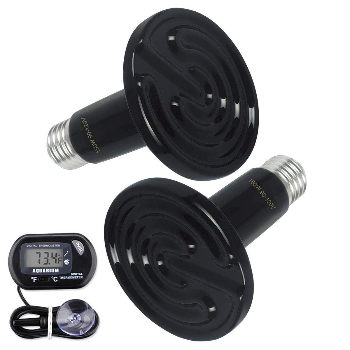 OMAYKEY 2-Pack 150W Ceramic Heat Lamp with 1-pcs Digital-Thermometer, Infrared Heat Emitter Bulbs for Reptiles, Amphibians, Chic