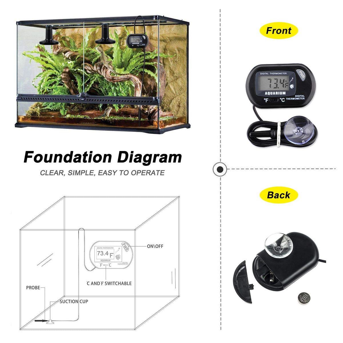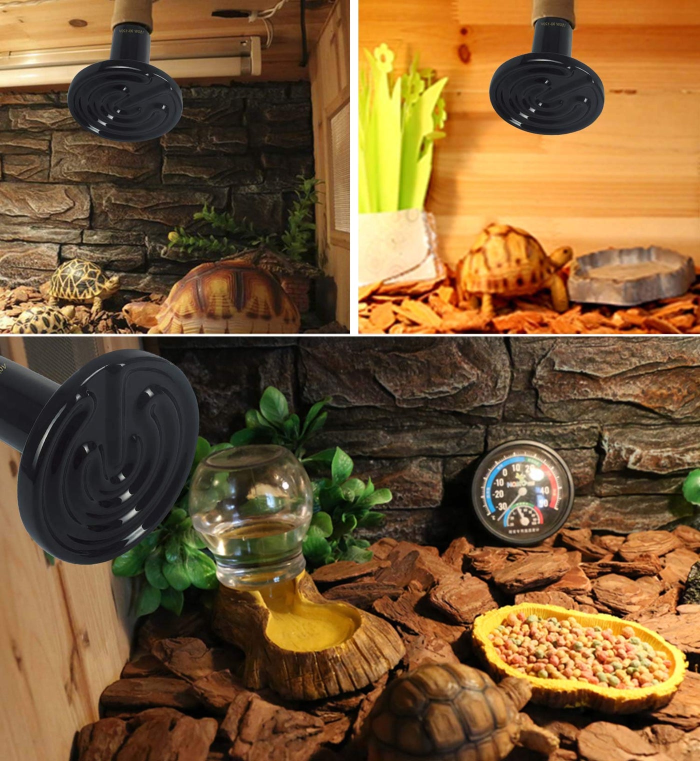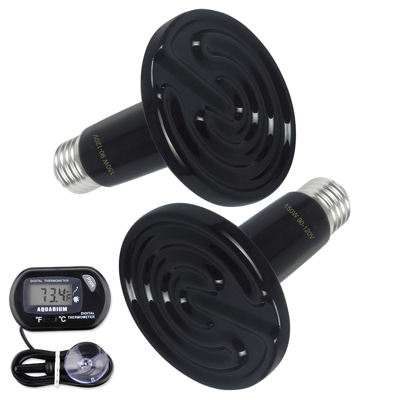 Product Characteristic: 1. This black ceramic heat emitter bulb is the perfect 24 hour heat source for reptiles and amphibians. 2. This infrared heat lamp is no light emitted, not disturb their normal sleep schedule (day or night). 3. Simple and Easy to Install: Screw into a standard porcelain E27 socket. Product Parameters: Material: Ceramic, Metal Heating Source: Ceramic, Infrared, Electrical, No Light Emitted. Socket: Only Porcelain Socket (E27) Input Voltage: AC 90V-120V. Power(Wattage): 150-Watts. Diameter of Heating Surface: 3.15 IN (Approx). Color: Black. Usage Suggestions: Heating, Chicken Coops, Brooding, Grow Light. Package Include: 2 x Ceramic Heat Lamp (Black) + 1 x Digital Thermometer. CAUTION: 1. Surface temperature is too high, do not directly touch during use. 2. Please adjust the distance between the lamp and the pet.