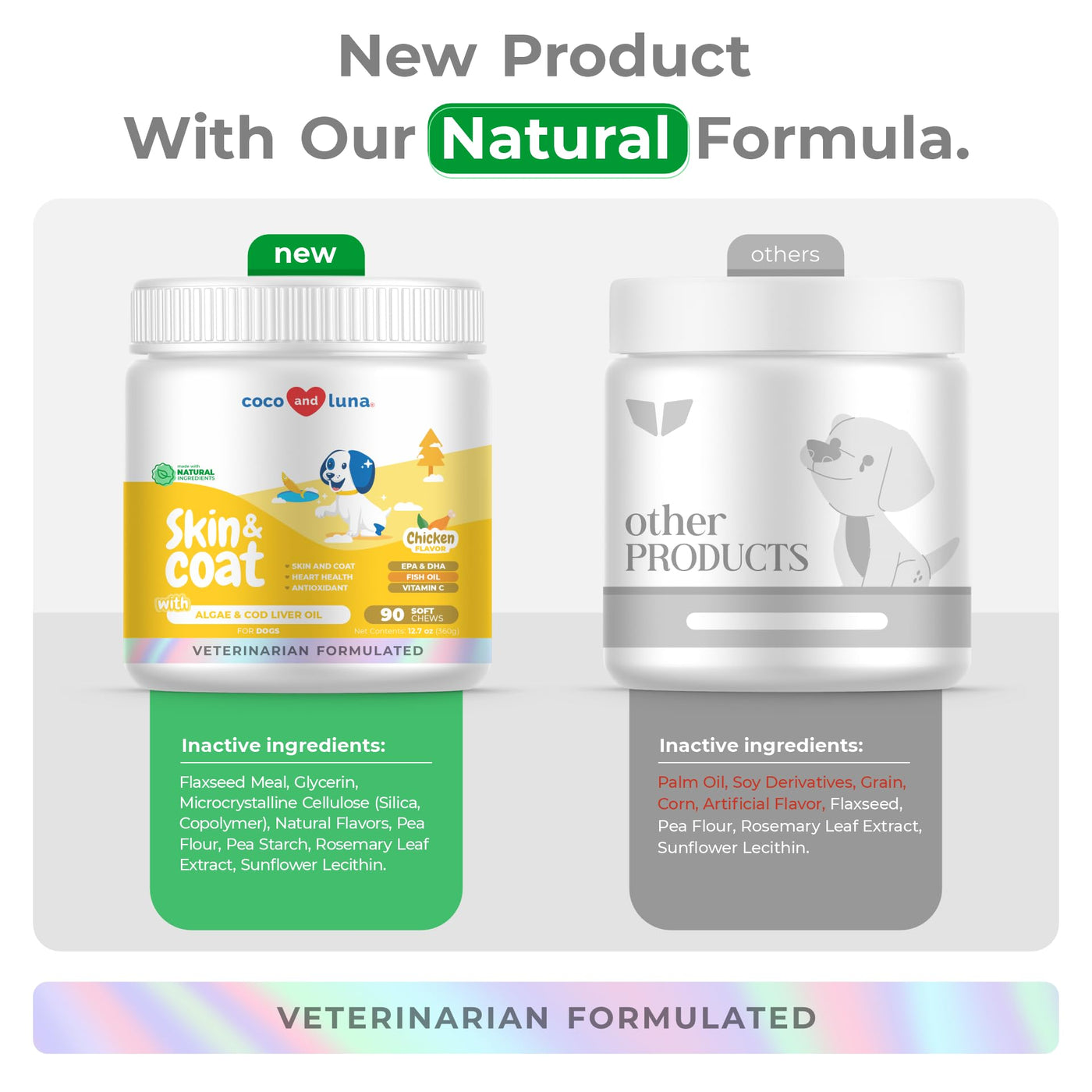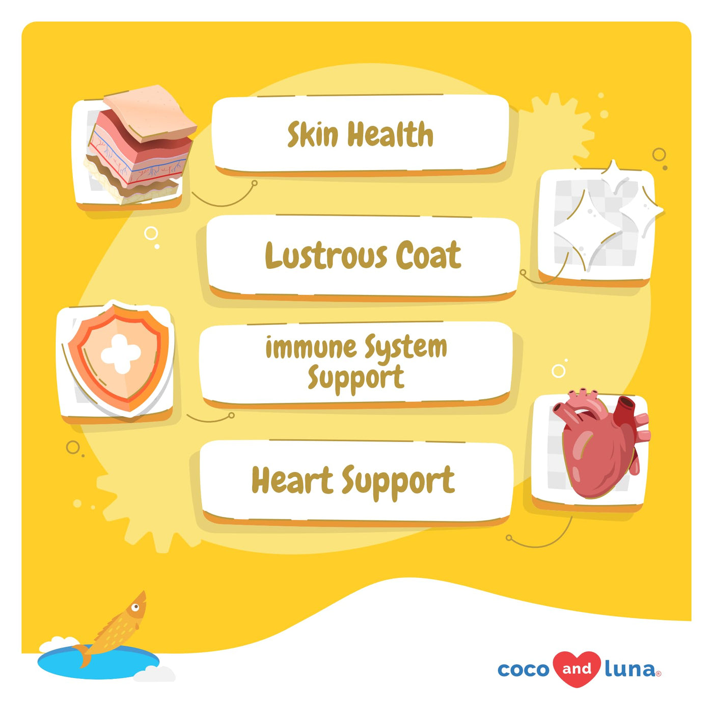 Our Coco and Luna Omega-3 for Dogs supplement is an incredible source of fish oil for your dog! Our formula will help relieve your dogs dry skin and also contains Vitamin E, that supports and boosts your dogs immune system. Is your dog shedding excessively? Our Omega 3 treats helps with coat conditions and hot spots, while protecting your dogs heart and immune system. If your dog has been feeding off processed pet foods, it couldnt hurt to put them on a of DHA and EPA fatty acids supplement to ensure their skin is as healthy as possible.
