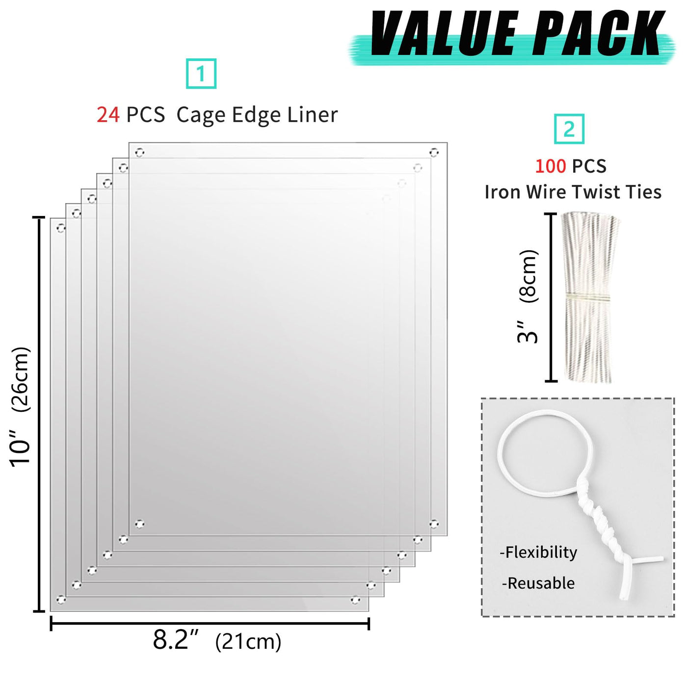 Keep your small pet 's habitat clean and tidy with the Oncpcare 24 Pack Pet Cage Liner Protection. These clear plastic liners are designed to line the sides of your rabbit, guinea pig, or other small animal 's cage, helping to contain litter and urine within the cage. Each liner measures 10 inches by 8.2 inches (26 cm by 21 cm), providing ample coverage for most small pet cages. The transparent material allows you to easily monitor your furry friend 's activities while keeping the cage walls protected from scratches and stains. Simply cut the liners to size and attach them to the cage bars or walls using the included clips or zip ties. When soiled, simply remove and replace with a fresh liner for hassle-free cleaning. Keep your pet 's living space hygienic and your floors clean with this convenient and practical cage accessory.
