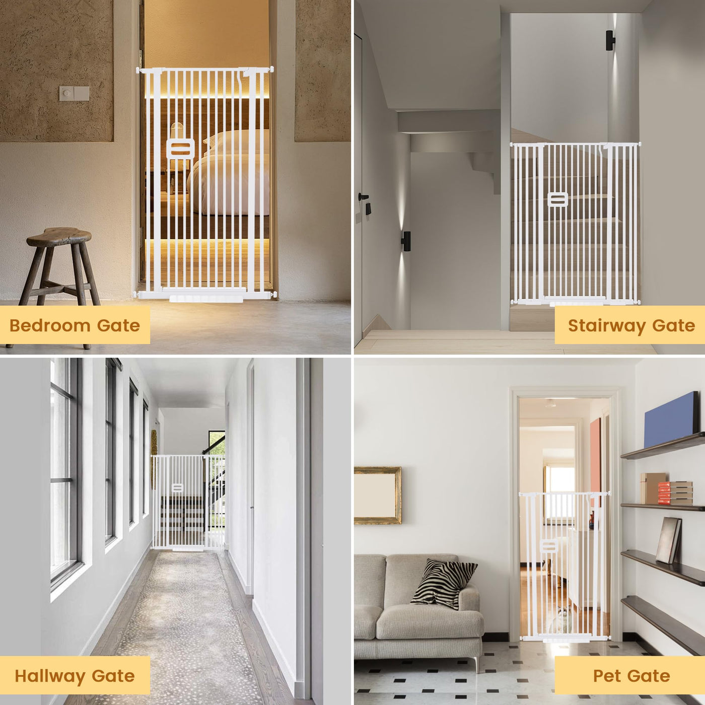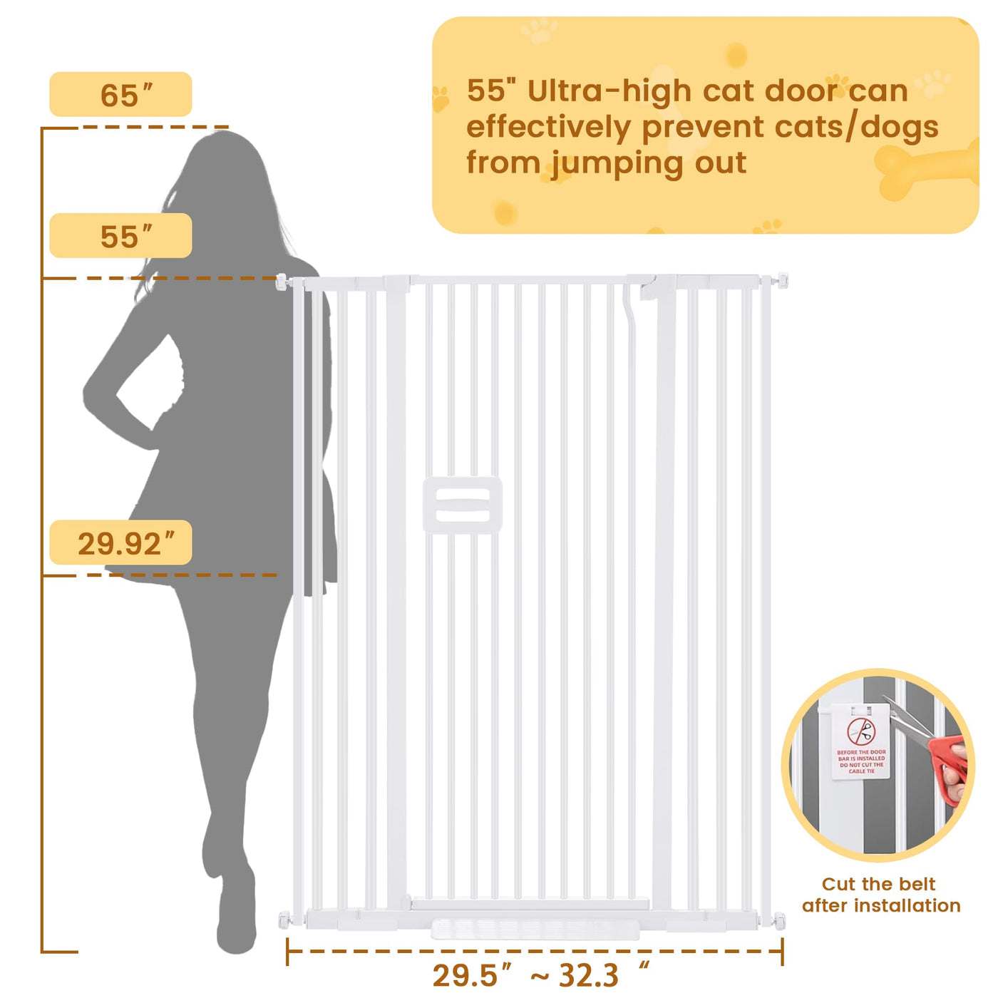 Q: What is the height of the OneBlis Extra Tall Cat Gate?A: The OneBlis Extra Tall Cat Gate stands at 55 inches, making it much higher than most pet gates available on the market, effectively preventing cats from jumping over.