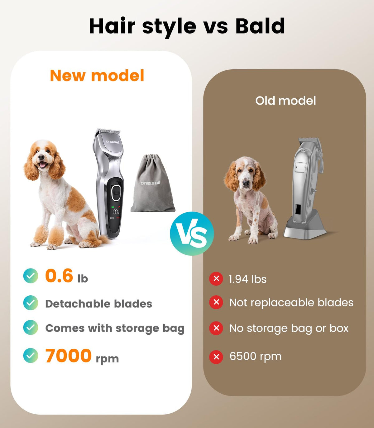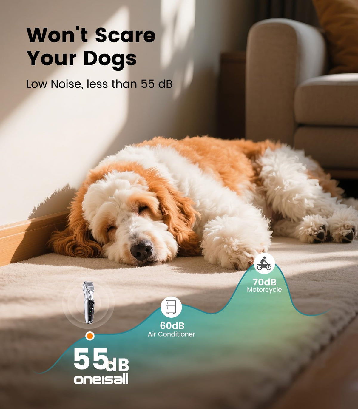 'Oneisall Detachable-Blade Dog Clippers 1. Low Noise For All Breeds Of Dogs 2. Heavy Duty For Thick-Hair Dogs 3. Light Weight For Home Groomer 4. Long Last Battery For Muti-Pet Families''