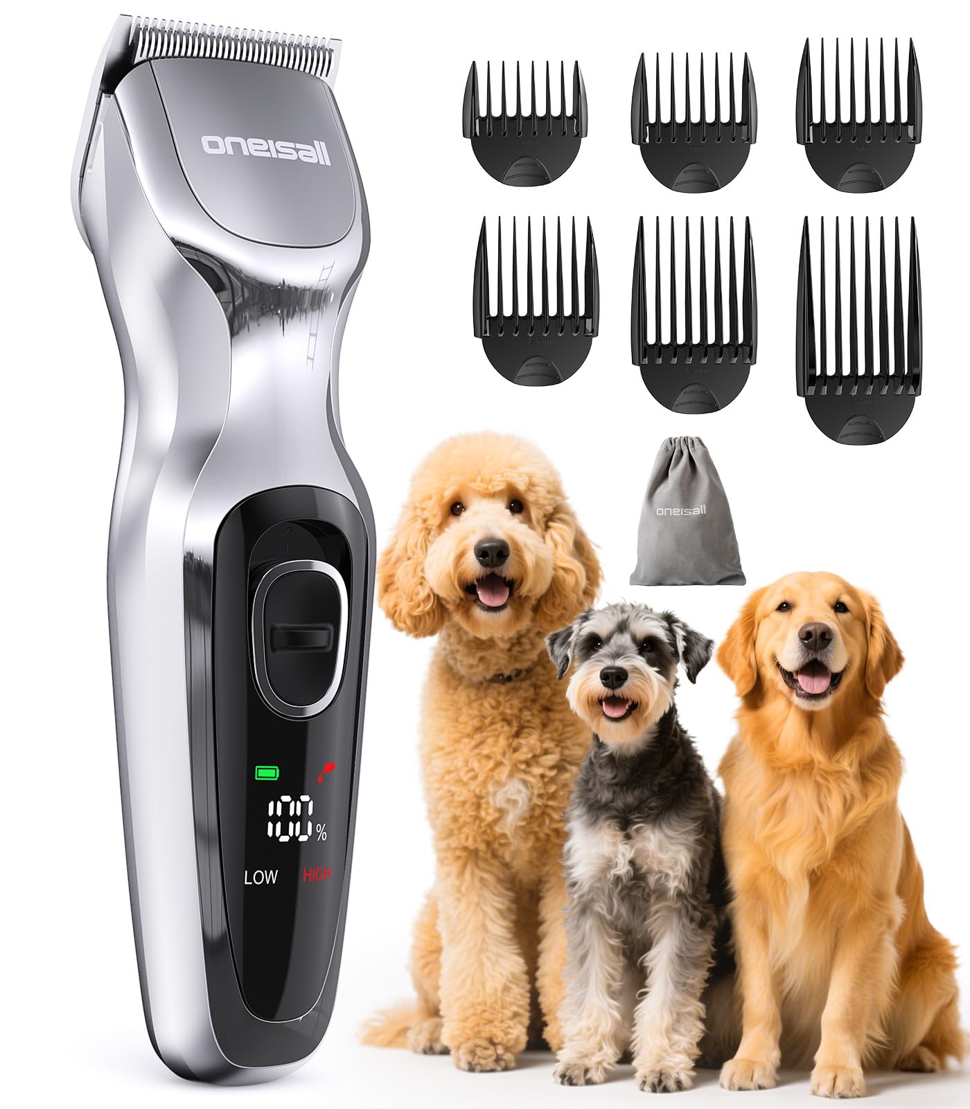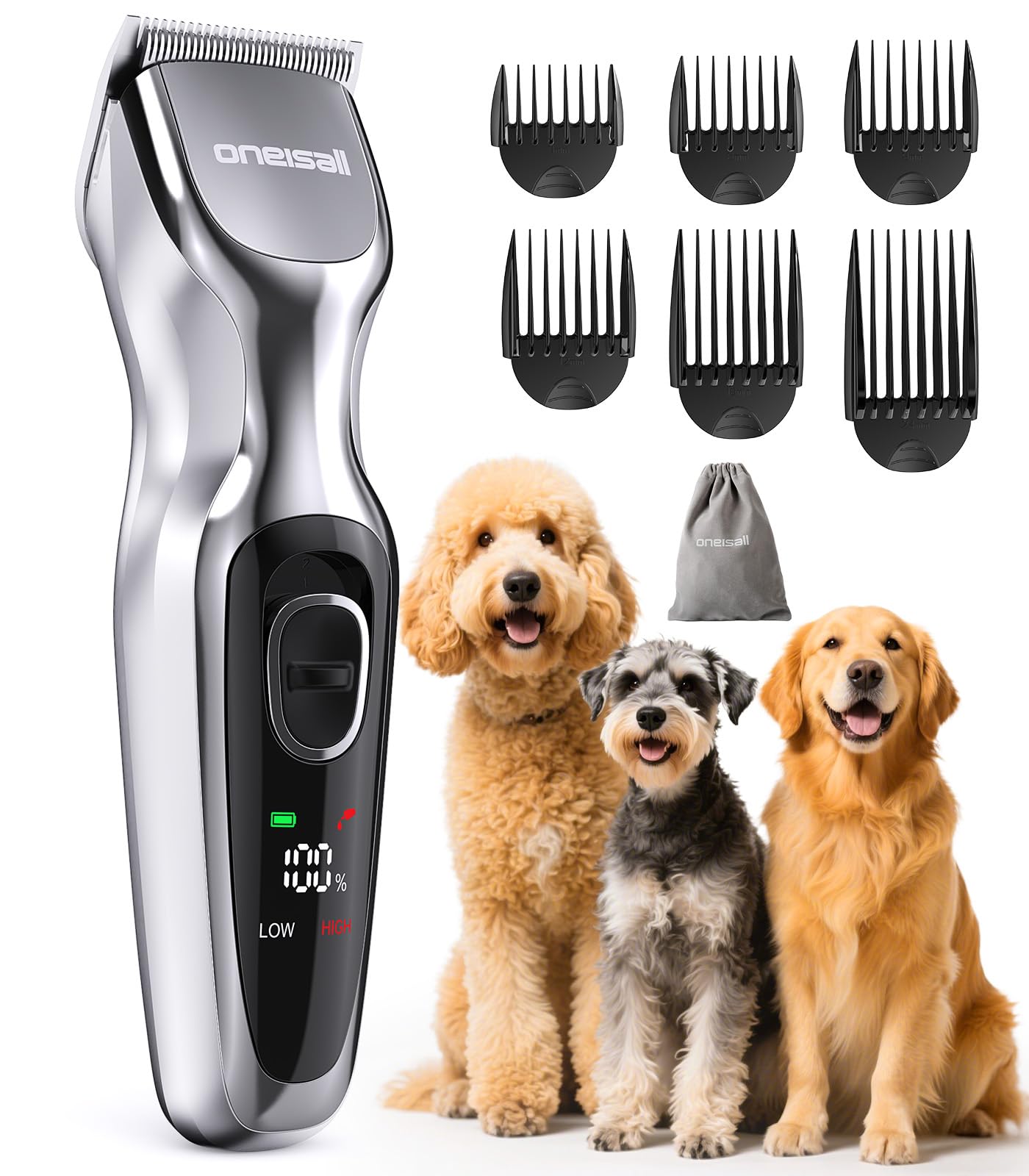 Oneisall Dog Clippers For Grooming Thick Hair, Low Noise Cordless Dog Shavers, 2-Speed Pet Hair Trimmer Grooming Kit For Home Gr