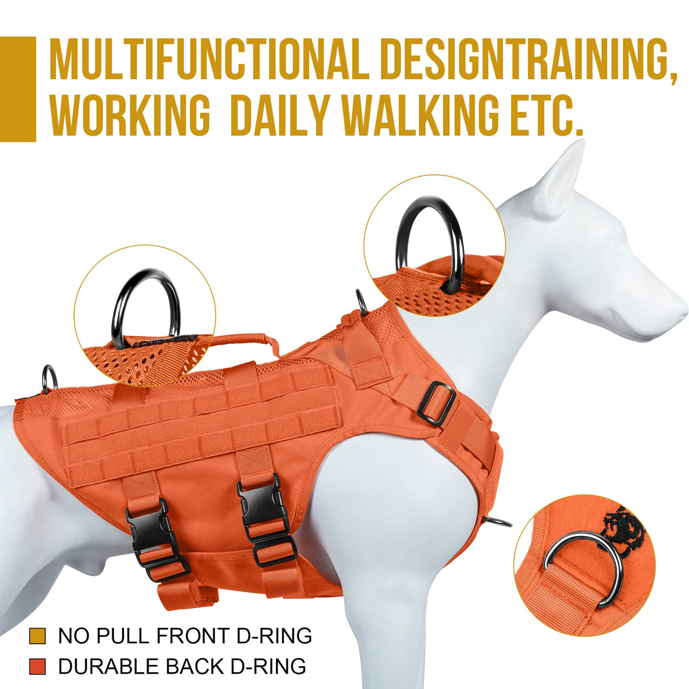 Onetigris No Pull Tactical Dog Harness, He Aire K9 Mesh Harness Is A Bliss For Muddy Spring Days And Hot Summer Walks. With The Same Tactical Style And Durability As Our Other K9 Gear On The Shelf, This One Offers Great Ventilation Through Sturdy 1000D Nylon And Mesh Fabric, Is Easy To Clean And Quick To Dry. There Are 2 Padded Handles With Reinforced Stitching At The Top, One Horizontal And One Vertical, Useful For Getting In/Out Of A Car, Maneuvering Your Pup Away From Trouble, Or For Training Sessions. Youll Find 3 Leash Clips At The Front Chest And Along The Back To Cater To Different Needs And Occasions Such As No-Pull Training, Hikes With Long Exploration Leashes, And Regular Daily Walks. And Of Course, We Wouldnt Leave Out The Tactical Touch Of Molle Compatible Patch Panels On The Sides For Modular Attachment Of Add-Ons And For Personalization With Morale Patches And Name Tags. This Is An Air-Light Yet Powerful Piece Of Kit For Adventures And Everyday Use.
