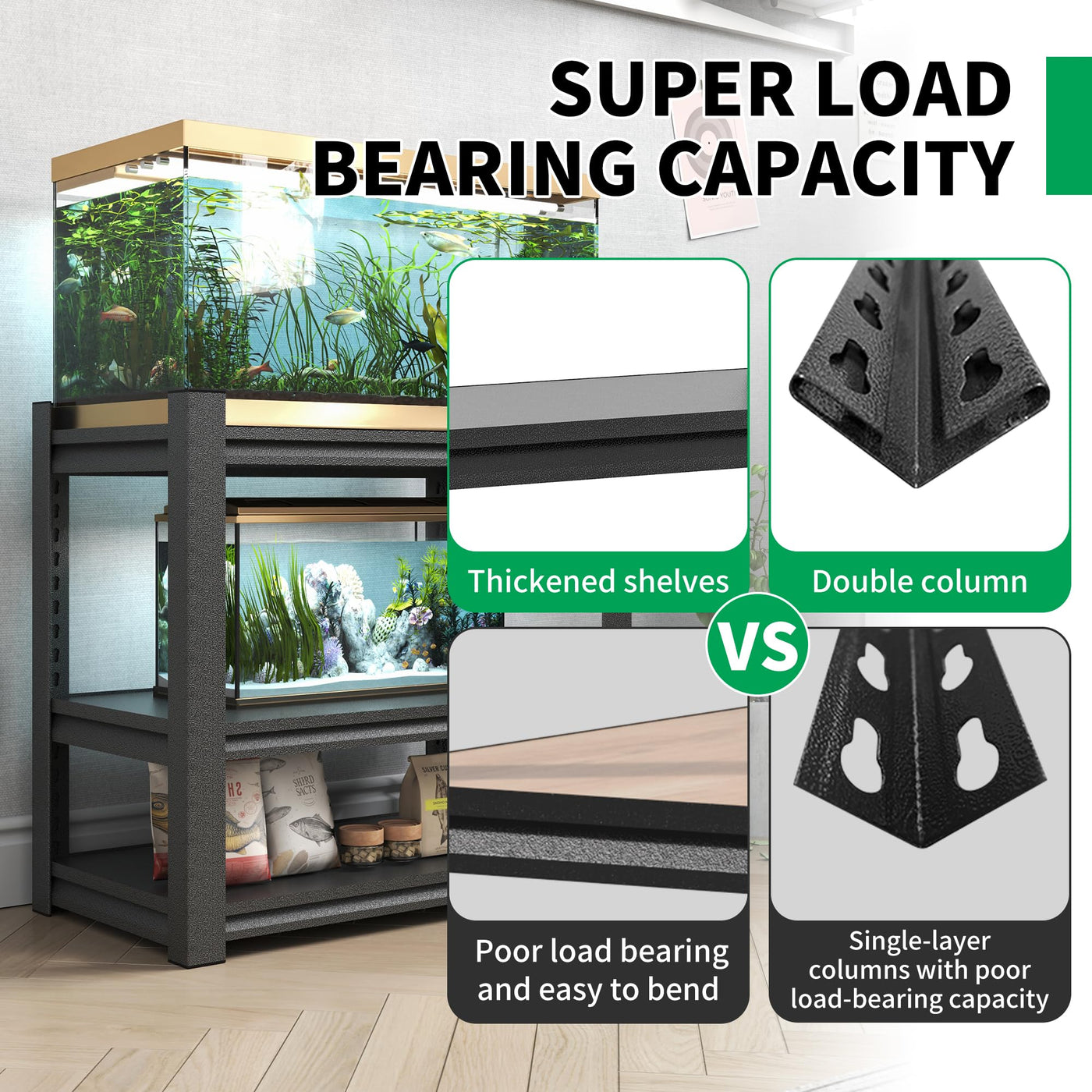 ?HEAVY DUTY FISH TANK STAND?This fish tank stand is made of heavy-duty steel, the shelves and columns are made of double-layered metal, there is 1 support beams underneath each sturdy thickened metal heavy-duty shelf, suitable for most 20-30 gallon terrarium stand, so its more stable and more durable than ordinary plastic or flimsy fish tank stands, and it wont bend due to the placement of the fish tanks.