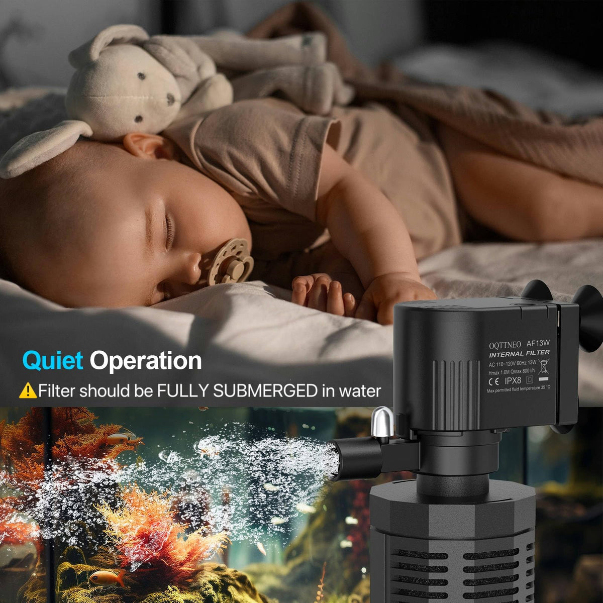 Oqttneo Aquarium Internal Filter For 20-50 Gallons, Ultra-Quiet Fish Tank Filter Biochemical Filtration 320Gph Powerful Pump Sub